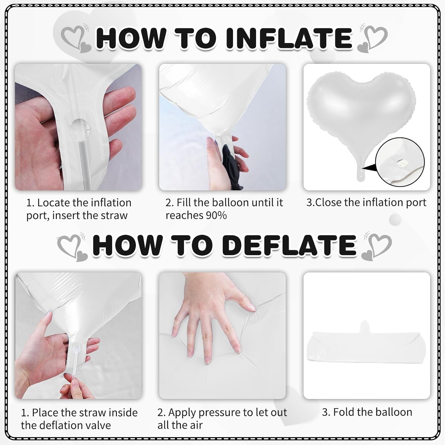 • 20 Inches Heart Balloons - Package contains 10 pcs white heart balloons, 1pc straw and 1pc ribbon.The white heart shaped balloon are ideal for any party. 20 inch is big and special enough to decorate your party and create a sweet and warm atmosphere!