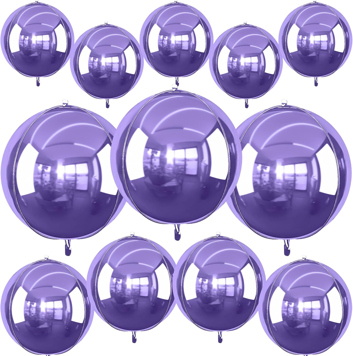 • Package: You will receive 12pcs 4D light purple round foil balloon, 3pcs 22inch + 4pcs 15inch + 5pcs 10inch + 1 straw + 1 roll of ribbon. Different sizes balloons in can meet your party needs. 10inch mini size balloons do not support helium filling and floating. The classic solid purple chrome balloons are perfect for any purple-themed party.