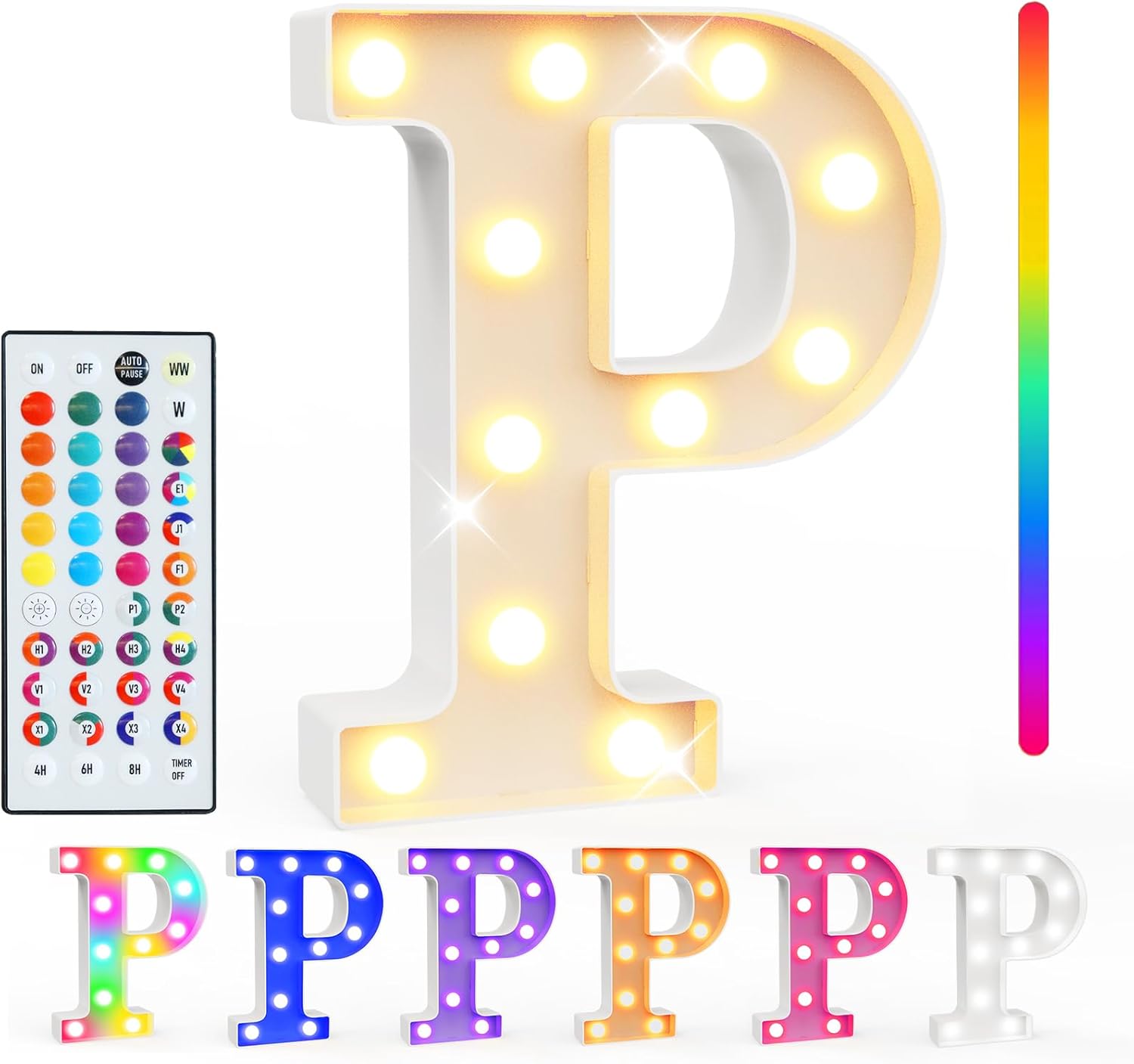 Pooqla Colorful Light Up Letters with Remote, Upgraded 35 Colors LED Marquee Letters, RGB Lighted Letter for Girls Teenager Gift, Birthday, Party, Wedding, Night Light, Room, Bedroom Decor, Letter P