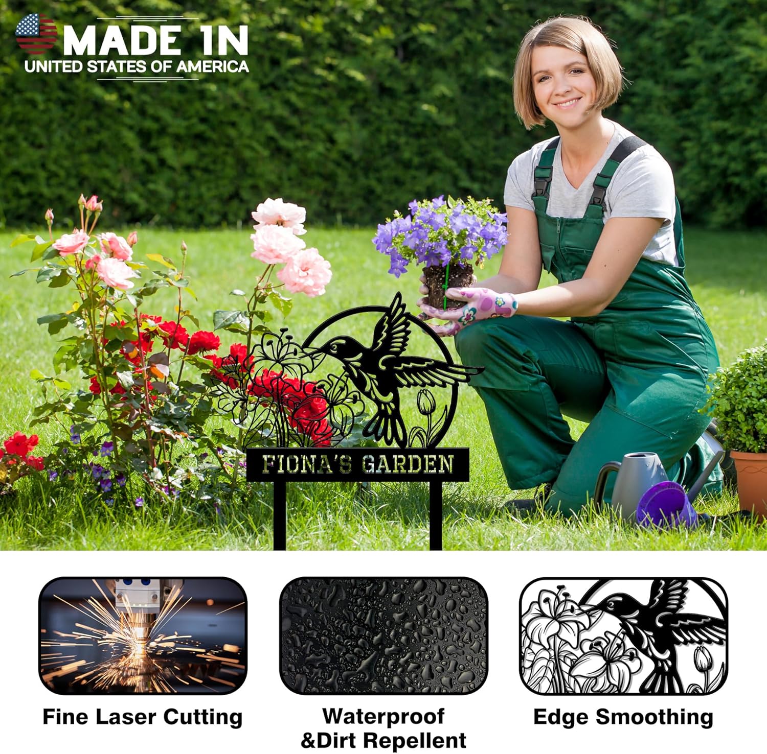 Personalized Garden Signs for Outside, Custom Metal Hummingbird Flowers Garden Decor with Stake, Custom Name Signs Outdoor Yard Patio Backyard Metal Decor Home Gifts