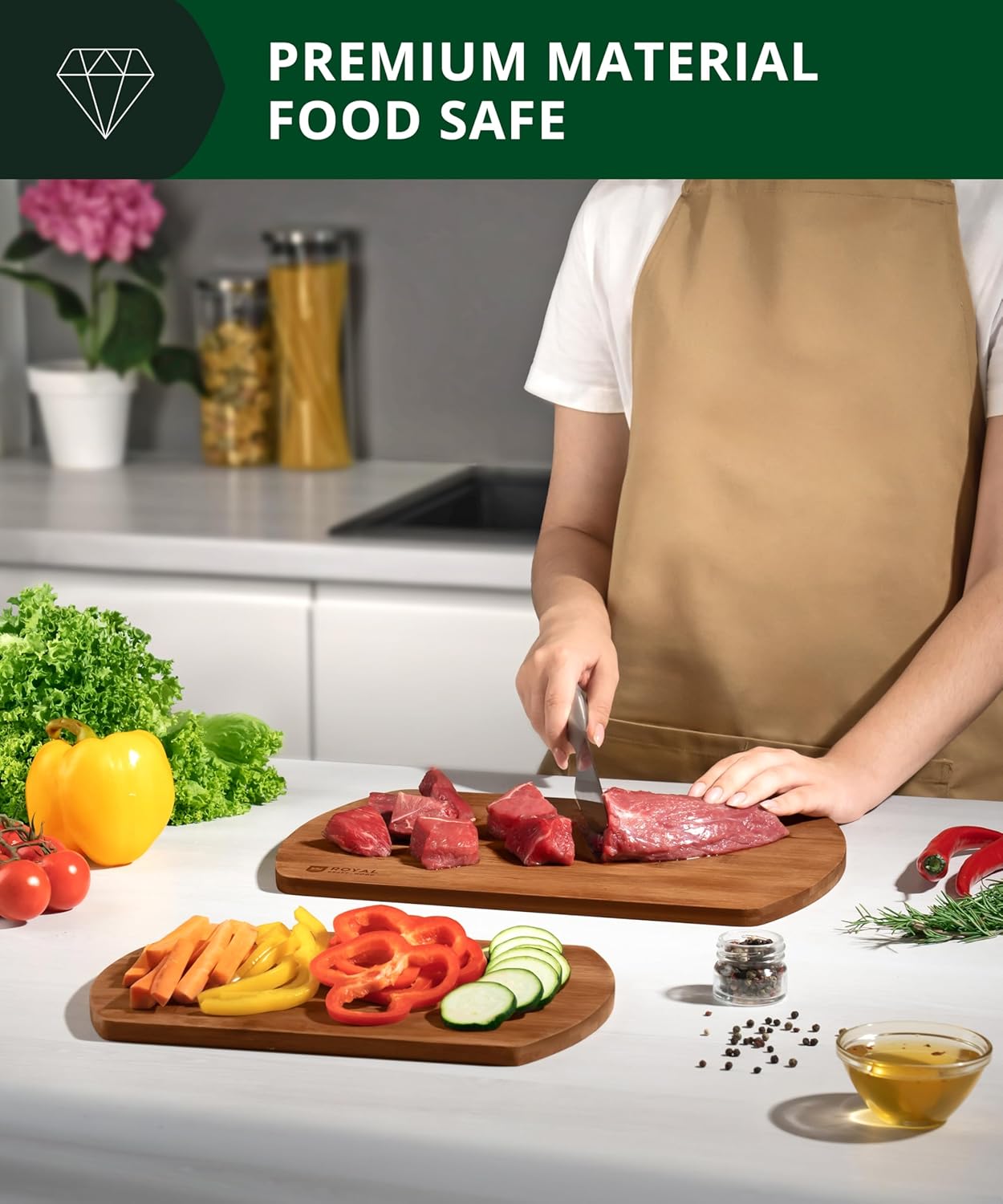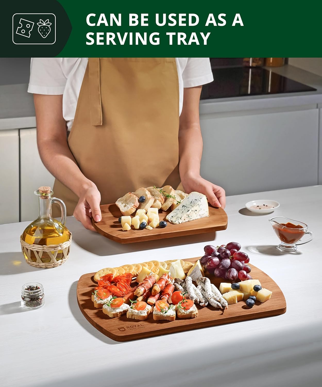 • 𝐄𝐋𝐄𝐆𝐀𝐍𝐓 𝐂𝐔𝐓𝐓𝐈𝐍𝐆 𝐁𝐎𝐀𝐑𝐃𝐒: Our newly designed 2 piece wood serving boards set is super slim & lightweight for easy use & maneuverability. The Royal Craft Wood bamboo chopping boards are available in 12”x8”, and 15”x10” options for your convenience, making this an all in one kitchen essential, allowing you to easily cut, meal prep, & even serve. Use the small board for quick fruit chopping, medium for multiple vegetables & large for slicing meat or for use as a charcuterie board.
