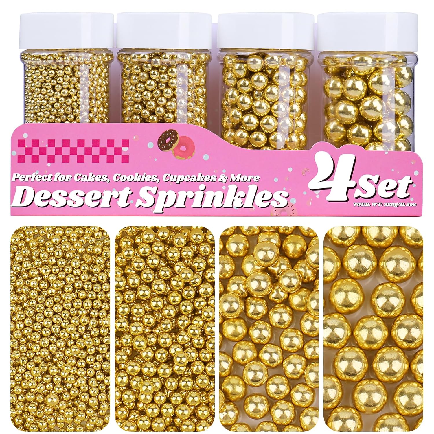 Gold Pearl Sprinkles for Cake Decorating, 11.3 Oz Edible Pearls Sugar 4 Sizes Gift Box Set for Baking Cookie Ice Cream Cupcake Toppings