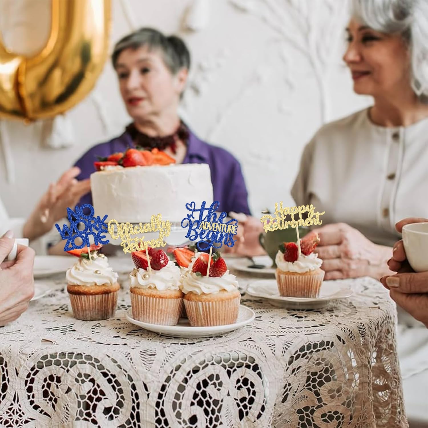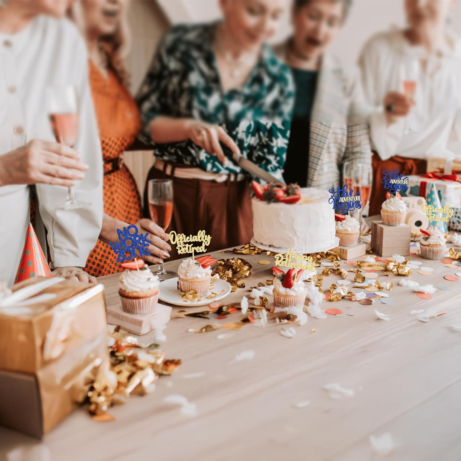 24Pcs Happy Retirement Cupcake Toppers Officially Retired Cake Toppers No Work Zone Adventure Begins Cupcake Picks Retirement Theme Farewell Birthday Party Decorations Supplies Gold Blue