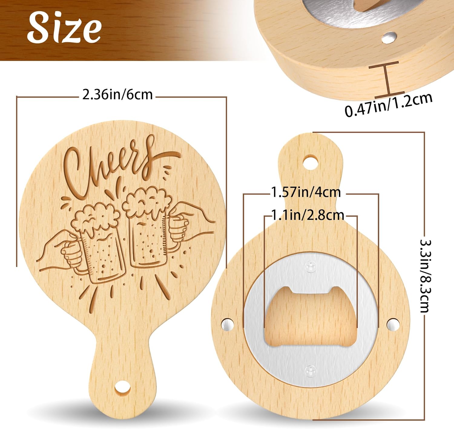 • Durable Magnetic Bottle Opener: The magnetic bottle opener has a diameter of 2.56 inches and a thickness of 0.47 inches, and has a strong magnetic attraction that will not slip off. With the exquisite magnetic design, these bottle openers can be firmly attached to the front and sides of the refrigerator for easy storage.