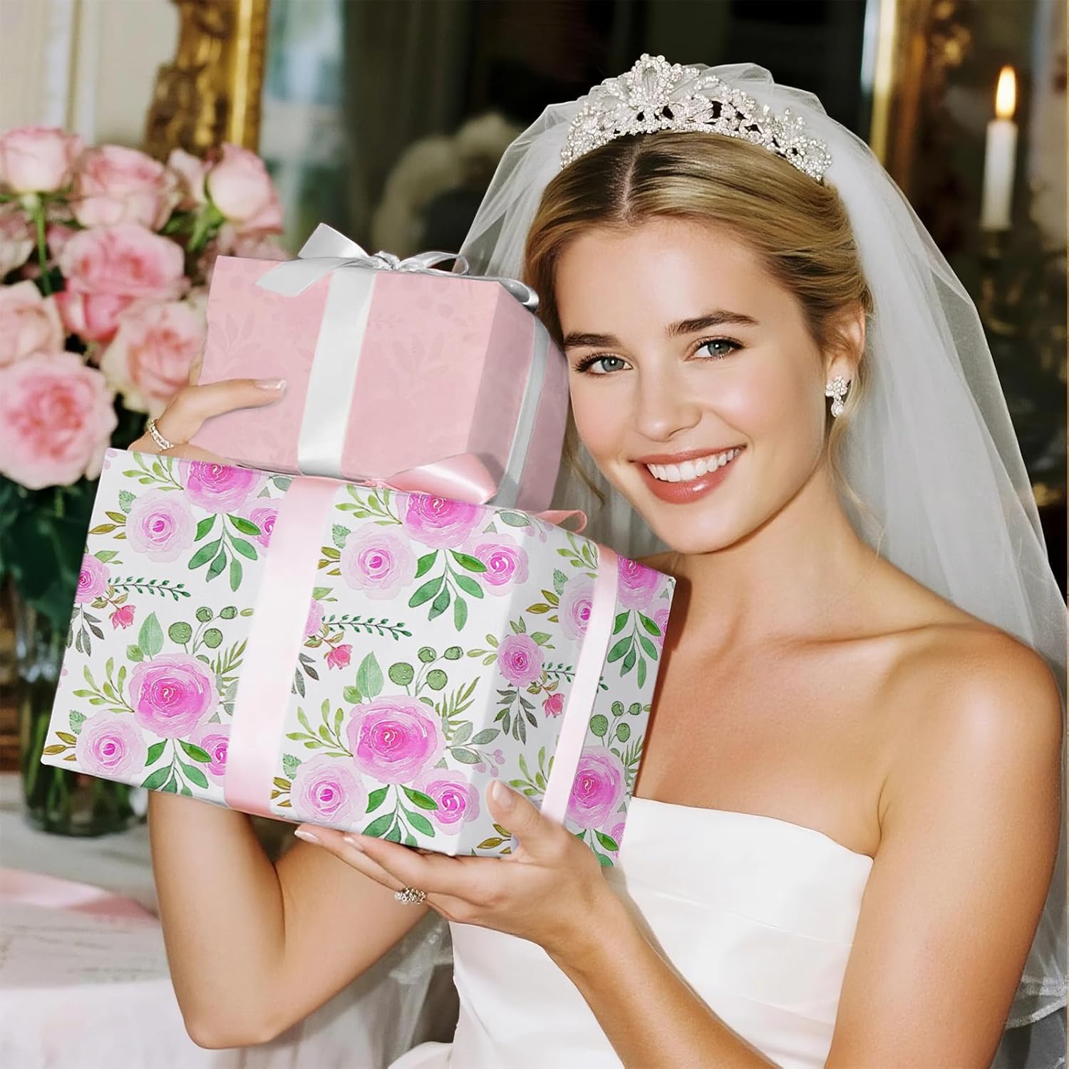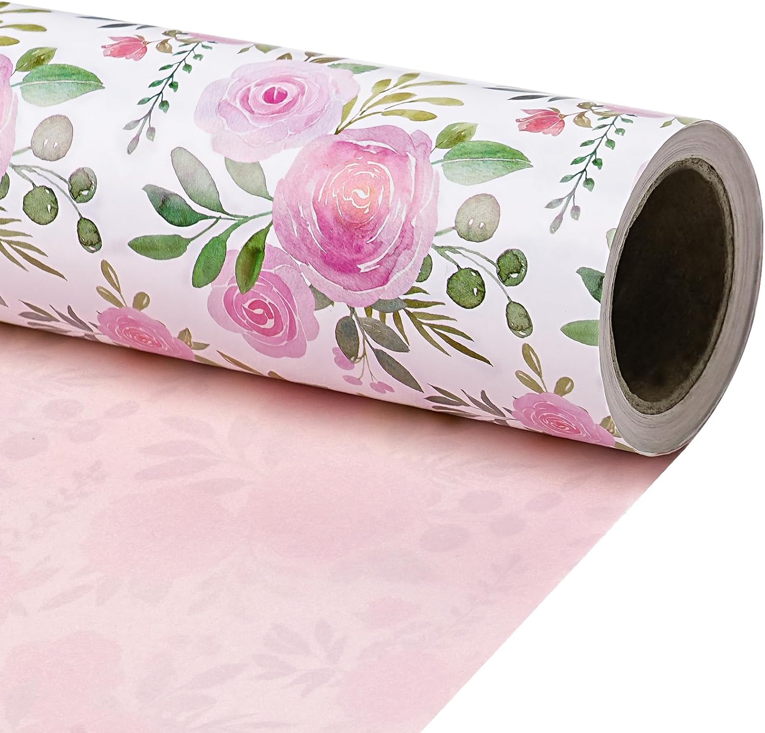 • Elegant Floral Reversible Design: One side showcases a charming pink rose blossom pattern with lush green leaves, while the other side features a classic solid pink color, two beautiful options in one roll