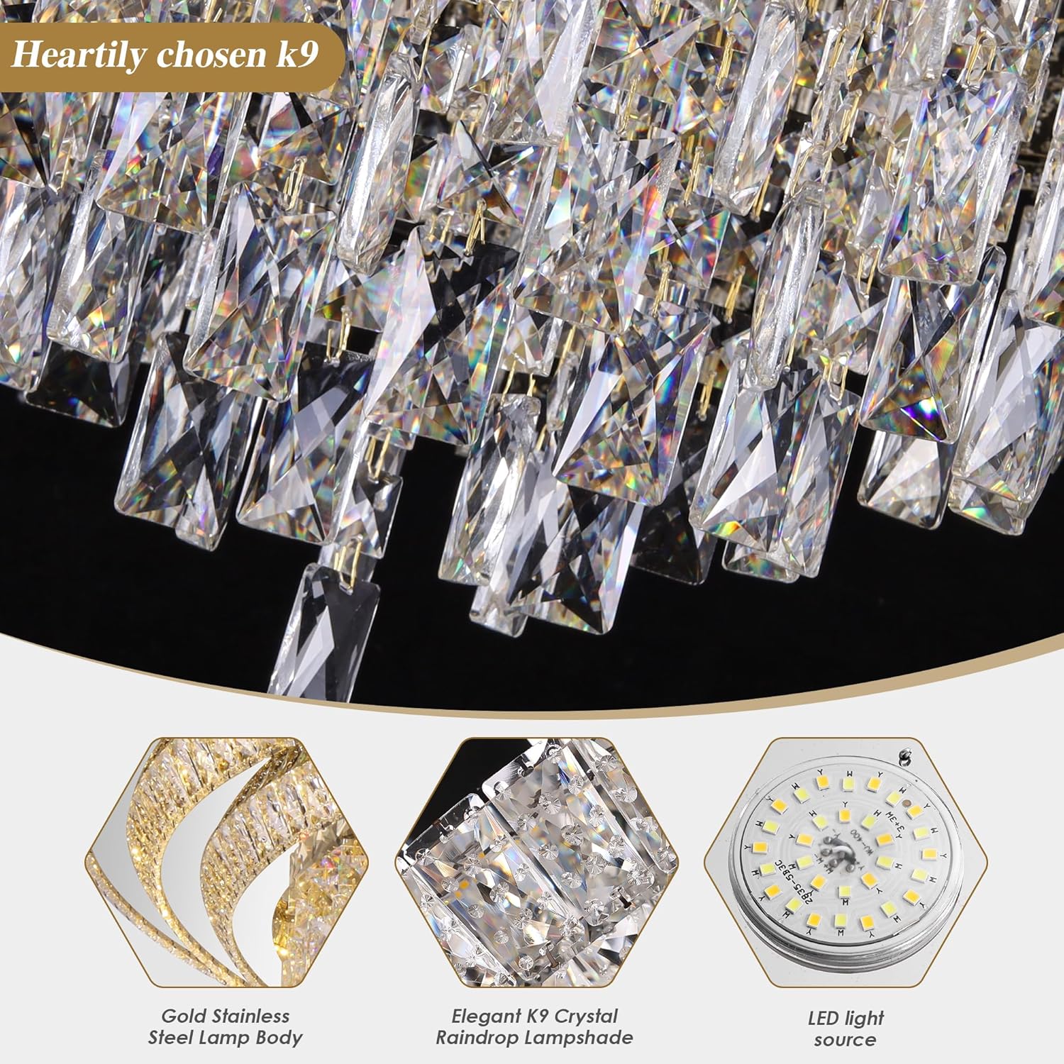 • Crystal flush mount gold ceiling light: made of K9 crystal and stainless steel; 3 modes lights Warm/natural/white is adjustable with wall switch; Coming remote is easy to control for all functions and temp or brightness's control.