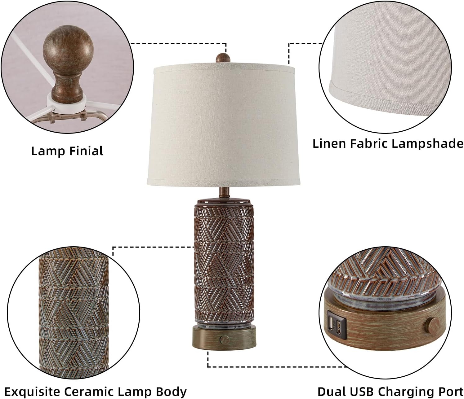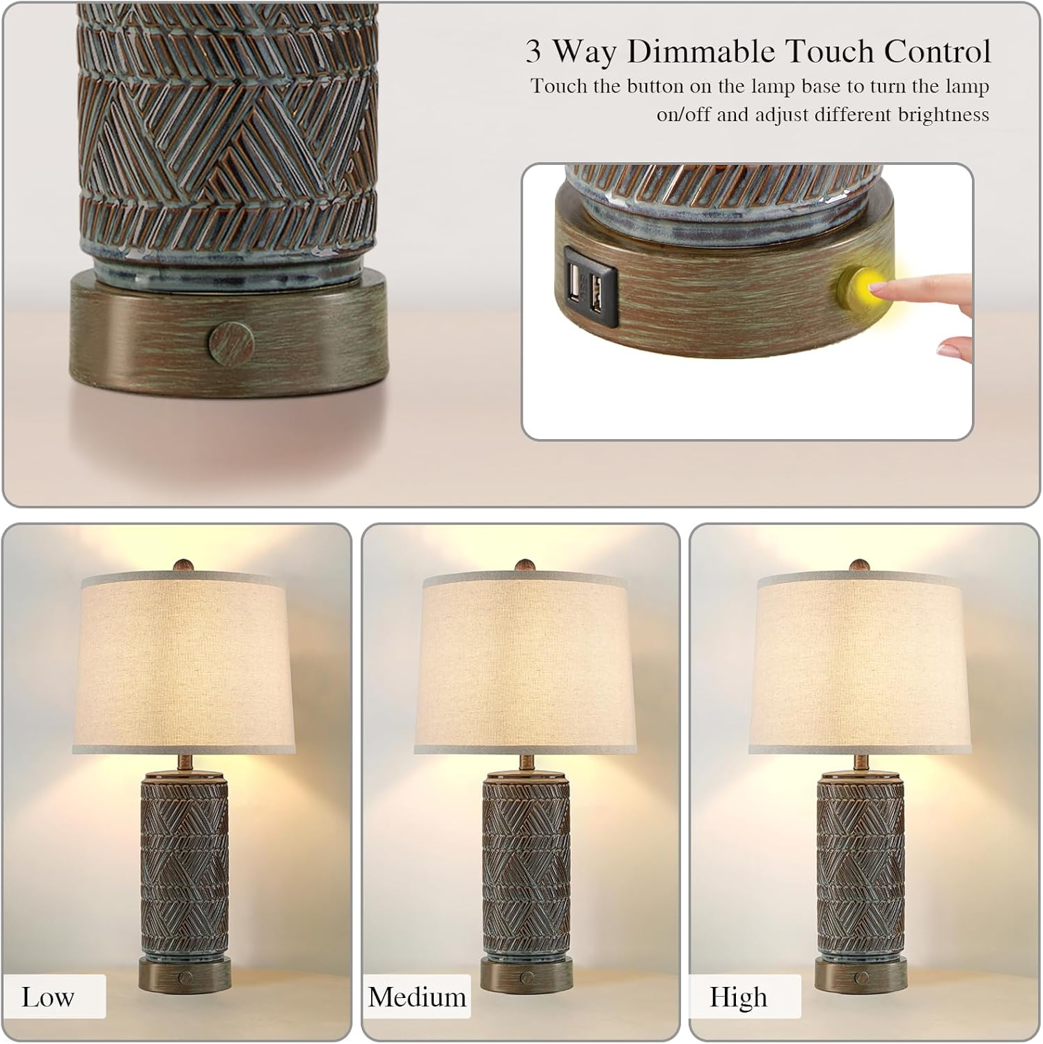 RORIA Set of 2 Farmhouse Table Lamps for Living Room Bedroom, 3 Way Dimmable Touch Nightstand Lamp with 2 USB Port, Rustic Vintage Bronze Ceramic Lamps for End Table Bedside, Bulbs Included