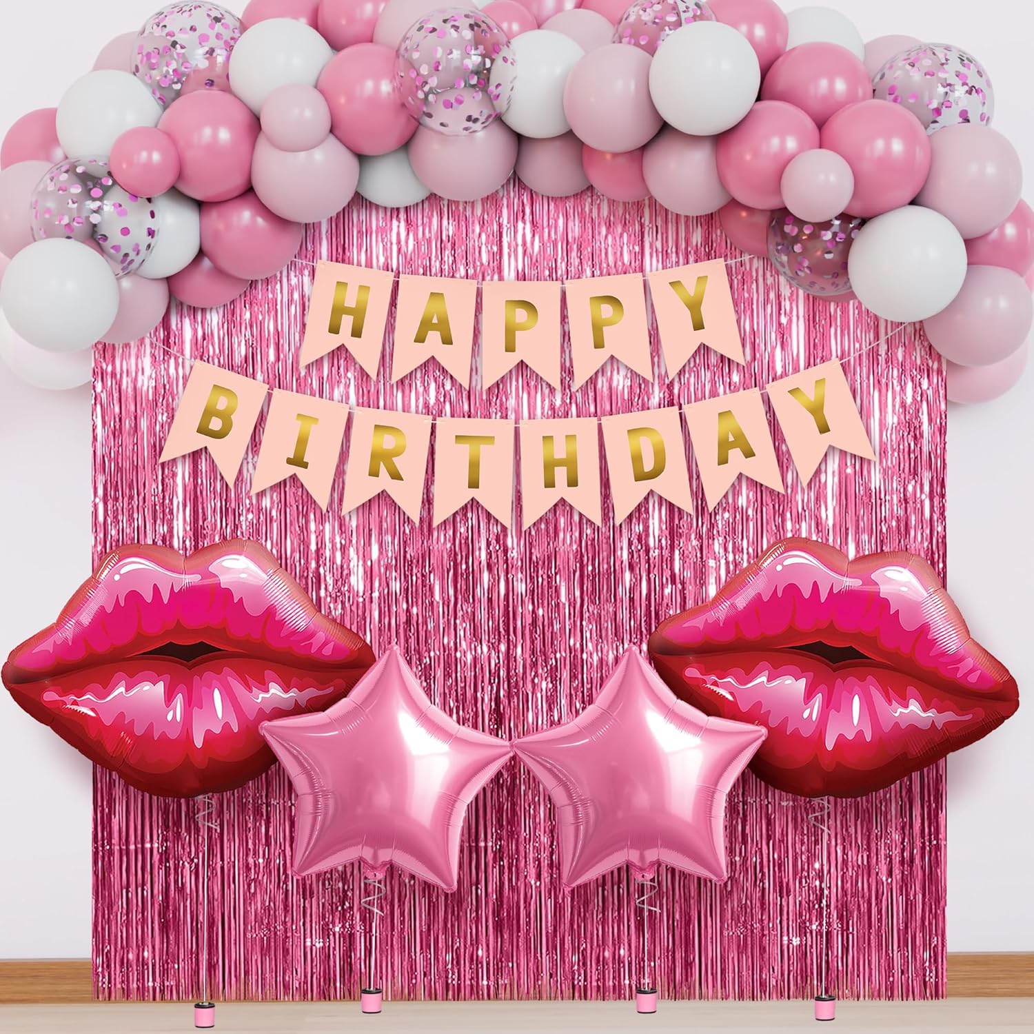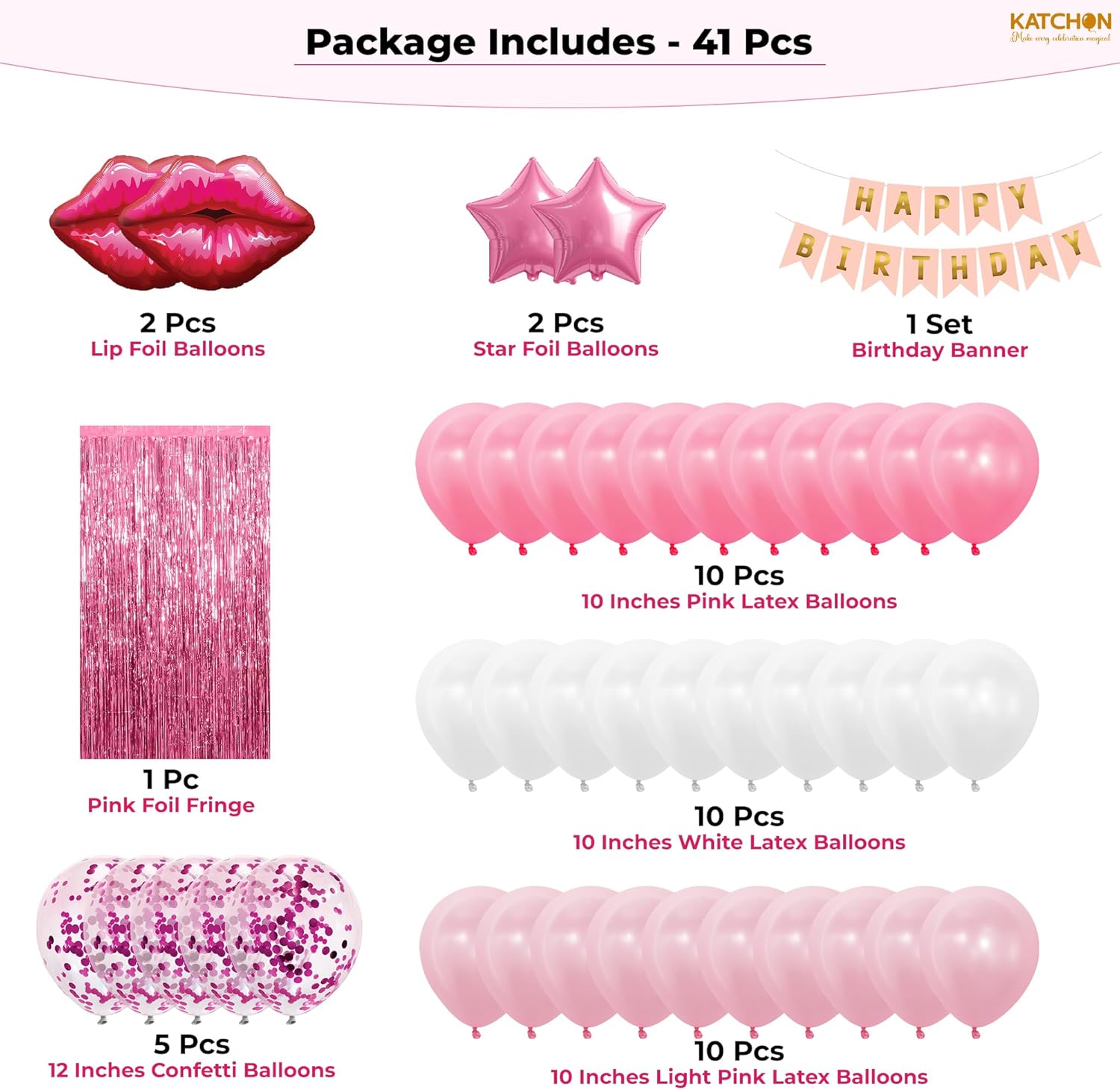 • COMPLETE PINK PARTY DECOR SET – This 41 pcs pink birthday decorations kit includes 1 set happy birthday banner, 2 pcs lip foil balloons, 2 pcs star balloons, 1 pink foil fringe, 10 pcs pink balloons, 10 pcs light pink balloons, 10 pcs white balloons, and 5 pcs confetti balloons for stunning party décor.