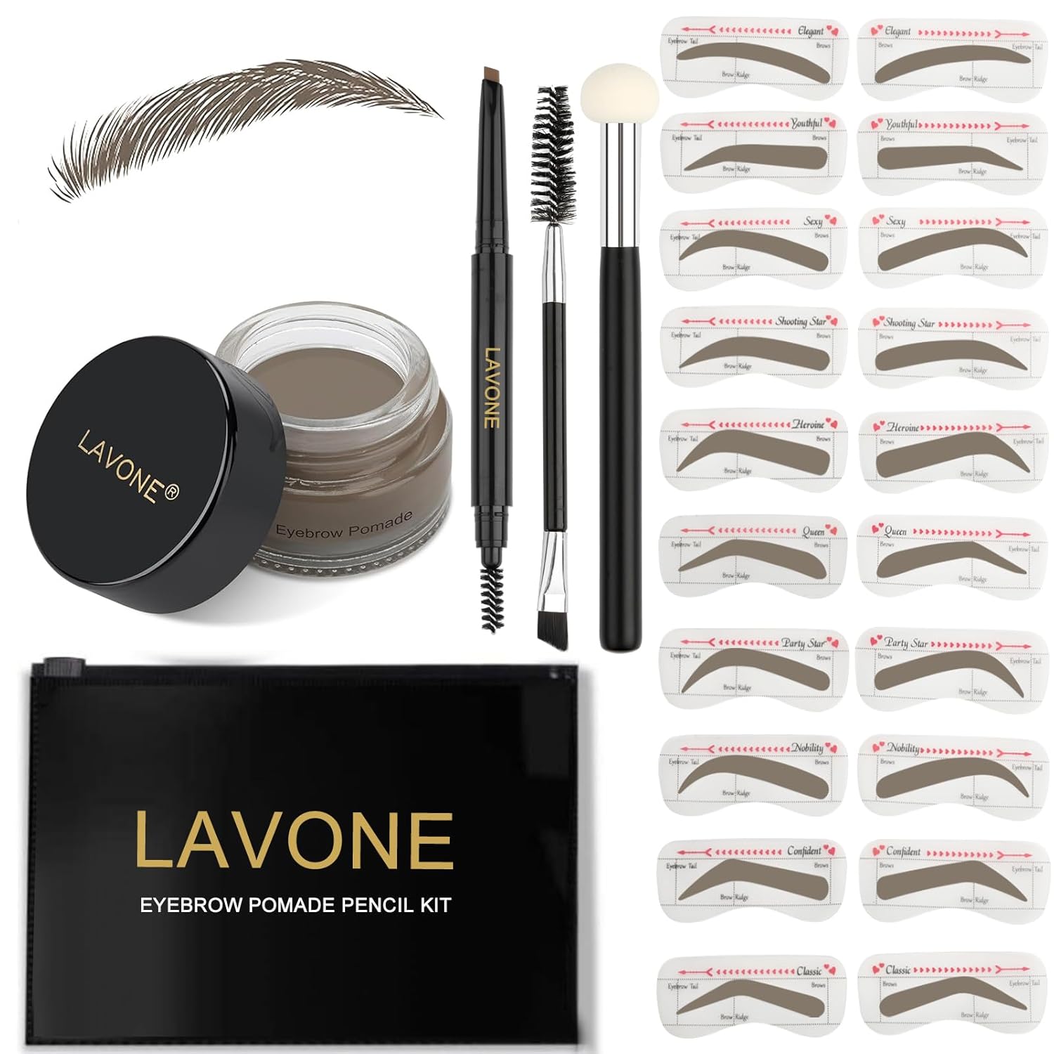 • [What’s in the eyebrow kit]: LAVONE makeup eyebrow kit includes eyebrow powder(dark grey), brow pencil (dark brown), 20 eyebrow stencils (10 different shapes), a sponge applicator, a dual precision brush and a zipper pouch for on the go.