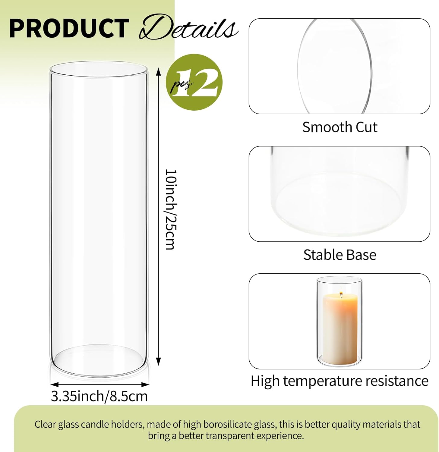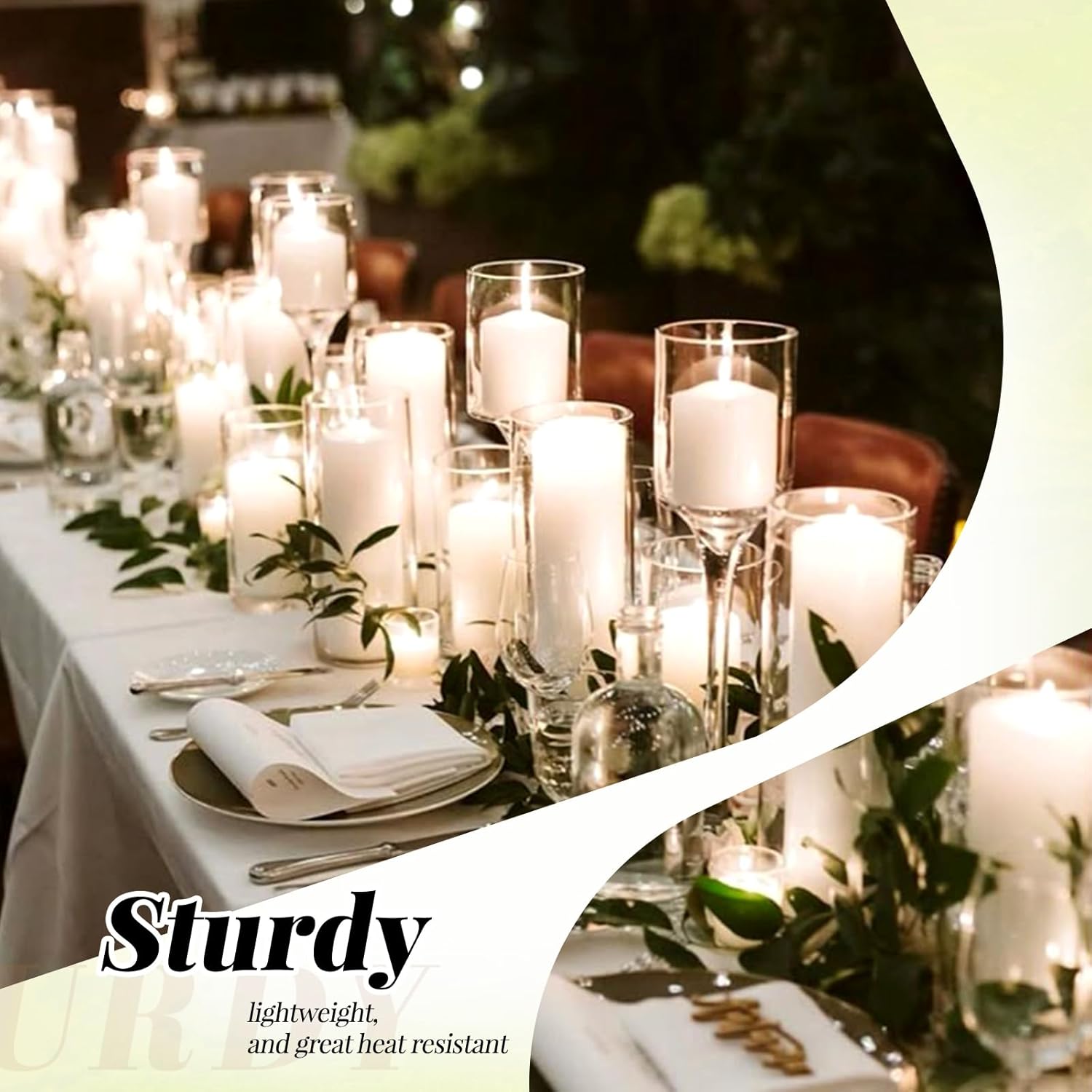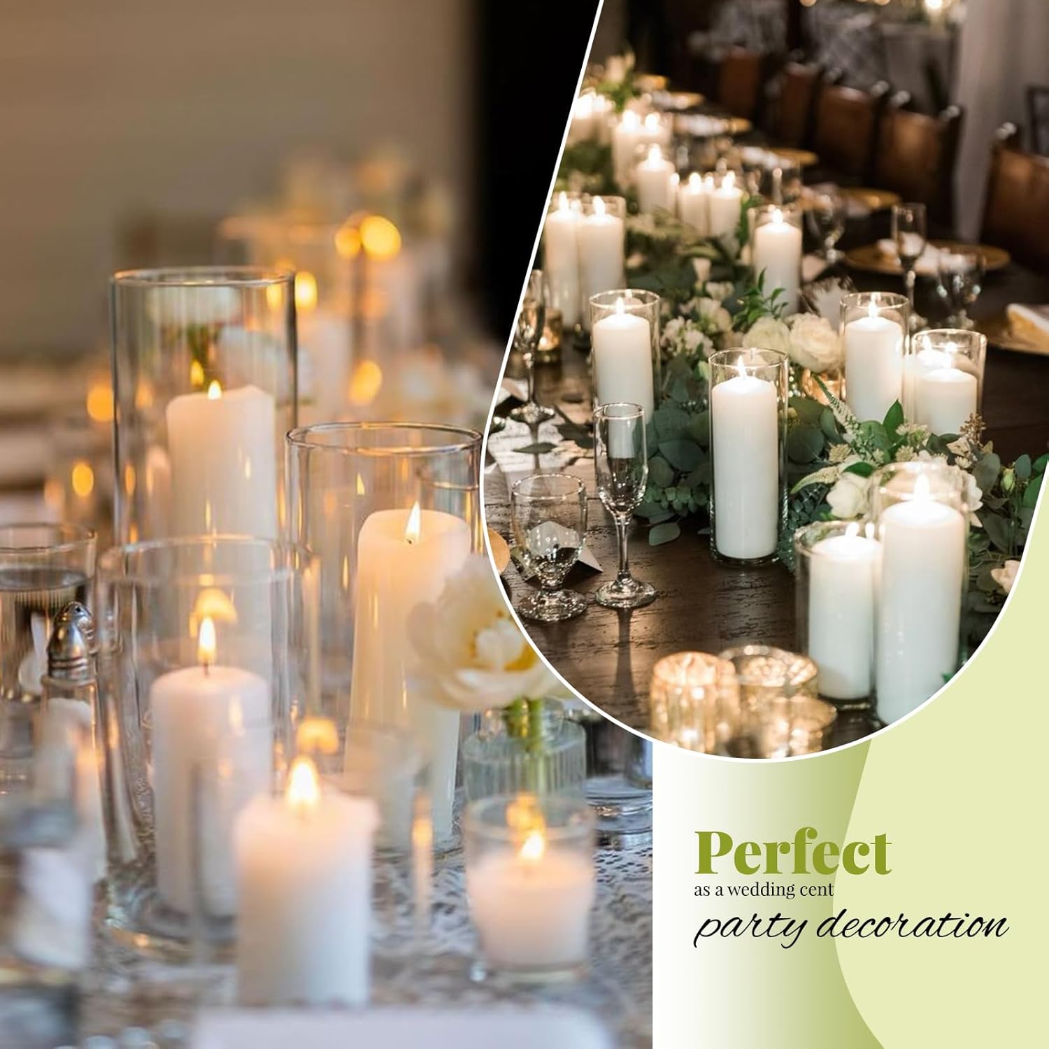 • โœ… Premium High-borosilicate Glass: Crafted from food-grade, heat-resistant borosilicate glass, our vases for centerpieces ensures exceptional clarity and durability. Designed with a solid base and smooth, polished rim, this flower vase provides stability and safety during use. This sturdy material can withstand greater temperature changes than regular glass. Perfect for use as a hurricane floating candle holder or for pillar candle holder.