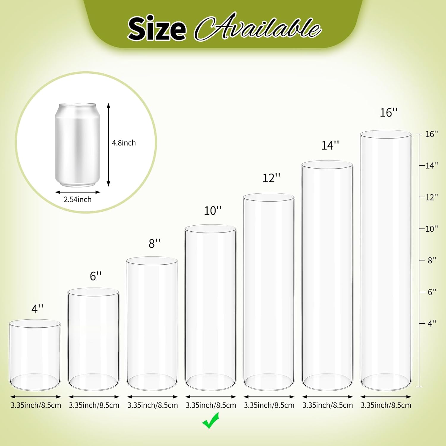 • โœ… Classic Cylinder Vase: This vase set contains 12 pack clear cylinder vases, the height is about 10 inch and the diameter is about 3.35 inch. Our glass vases are available in sizes from 3.35*4" to 3.35*16", ideal for various flower vases, vases for centerpieces, and candle holders. Its versatile uses makes it perfect for creating elegant centerpiece table decorations.