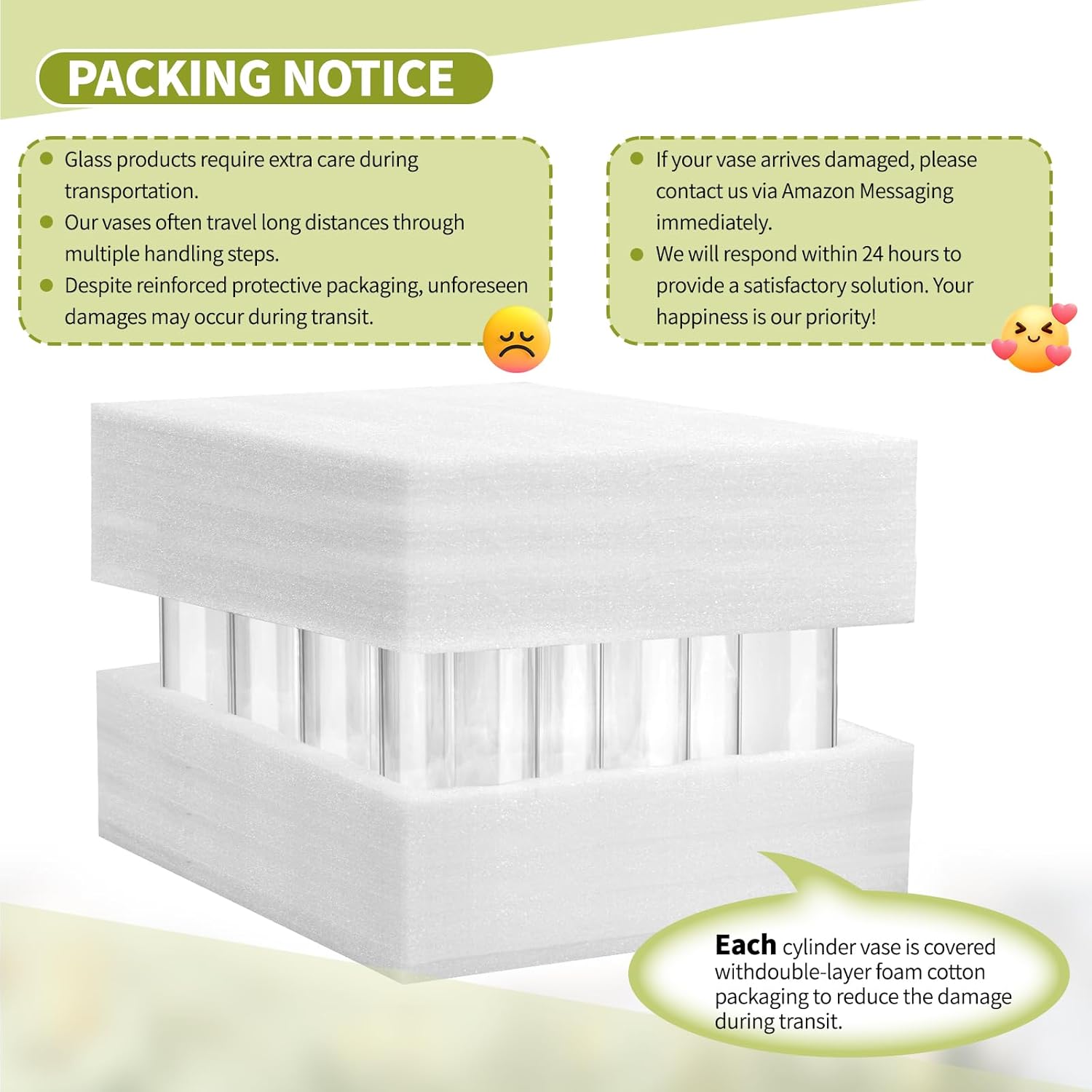 • โœ… Safe Package: Each glass cylinder vase arrives carefully protected with dual-layer foam cotton to prevent transit damage. But if anything arrives less than perfect? No worries. Just message us via Amazonโ€”weโ€™ll respond within 24 hours and make it right. Your happiness is our priority!