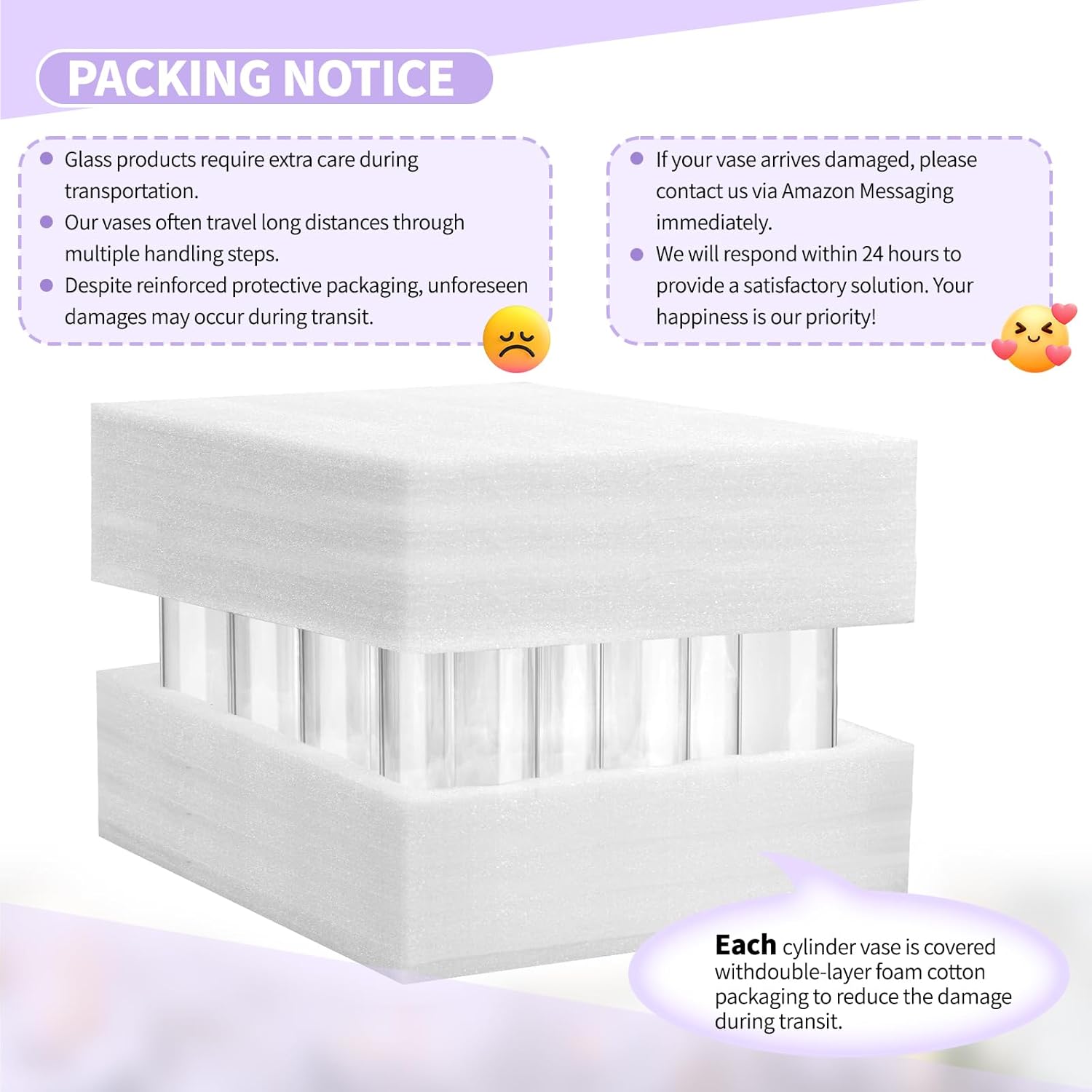 • โœ… Safe Package: Each glass cylinder vase arrives carefully protected with dual-layer foam cotton to prevent transit damage. But if anything arrives less than perfect? No worries. Just message us via Amazonโ€”weโ€™ll respond within 24 hours and make it right. Your happiness is our priority!