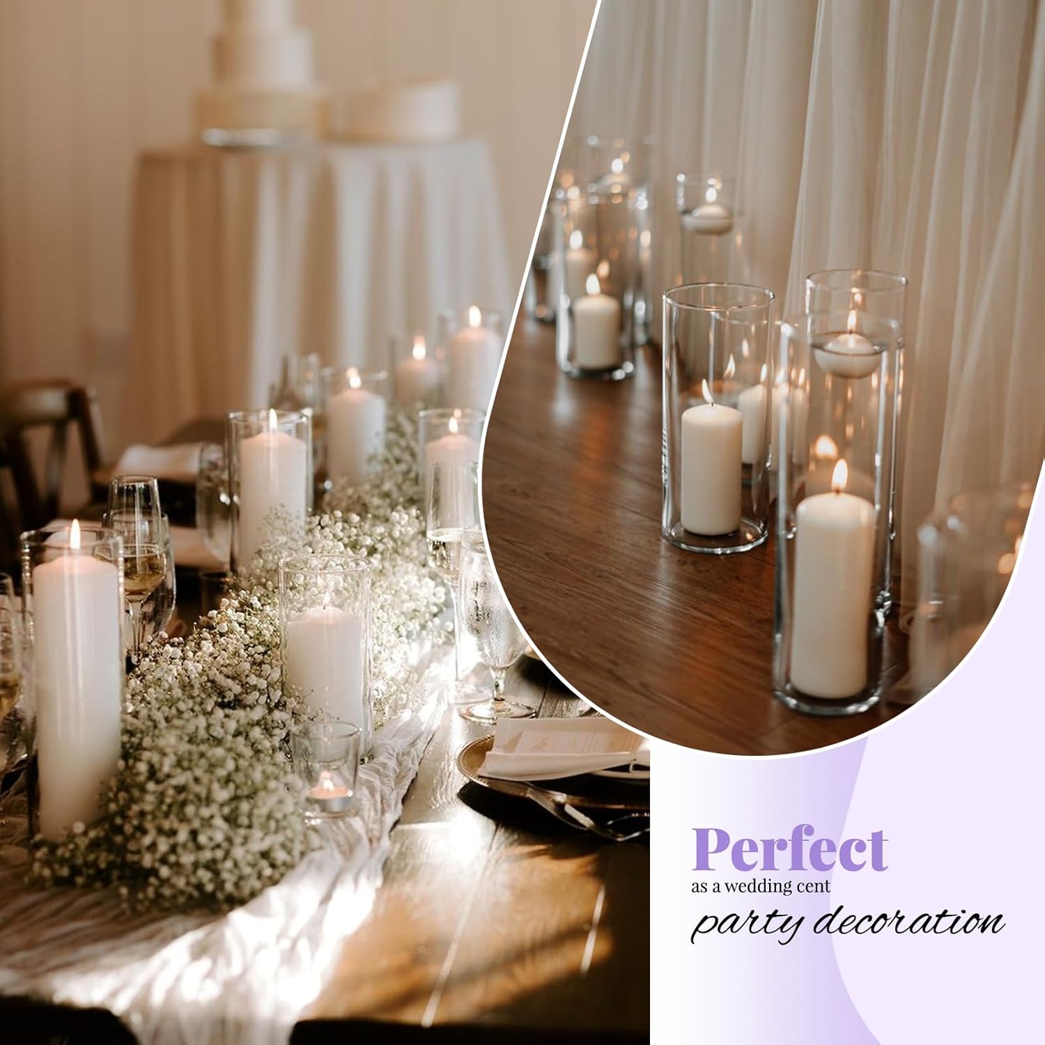 • โœ… Premium High-borosilicate Glass: Crafted from food-grade, heat-resistant borosilicate glass, our vases for centerpieces ensures exceptional clarity and durability. Designed with a solid base and smooth, polished rim, this flower vase provides stability and safety during use. This sturdy material can withstand greater temperature changes than regular glass. Perfect for use as a hurricane floating candle holder or for pillar candle holder.