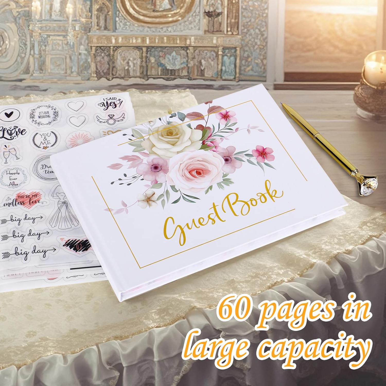 • Package Includes: You will receive 1 wedding guest book,and a golden diamond pen,4 wedding stickers (with rich and colorful sticker patterns)can be used to stick photos to your guestbook or for decoration,a keepsake box to preserve your memories.