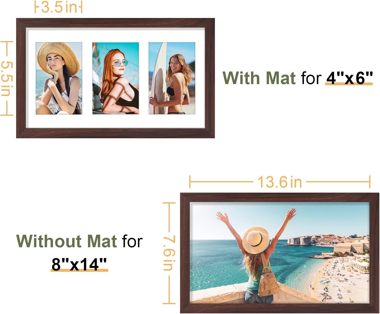 • Perfect Photo Fit: The 8x14 collage frame holds three 4x6 photos with mat or one 8x14 photo without mat. Each 4x6 opening is designed 0.5 inches smaller for a secure grip in this 8x14 frame