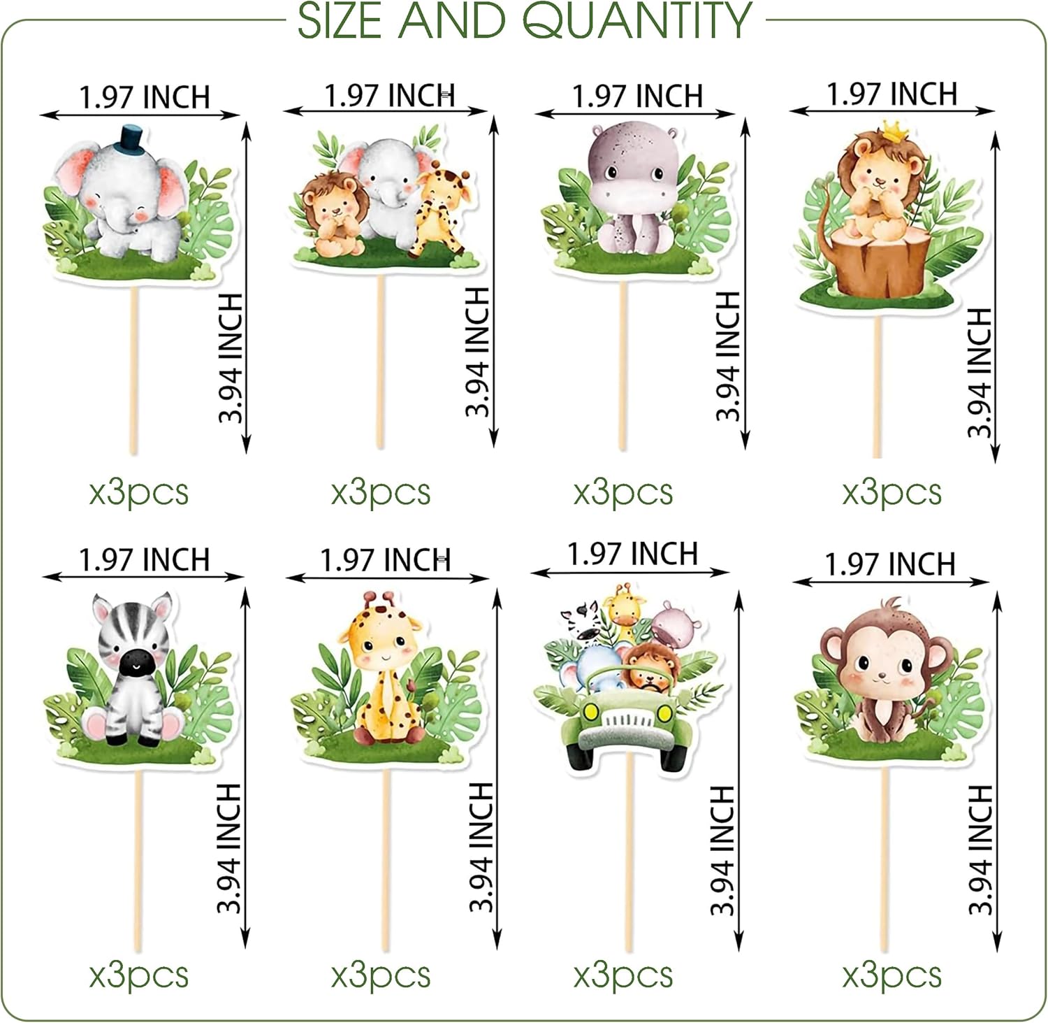• Assorted Safari Friends: Includes 24 high-quality cupcake and cake toppers—4 each of 6 adorable jungle animal designs (lion, elephant, giraffe, zebra, monkey, hippo)—to bring the wild-one theme to life.