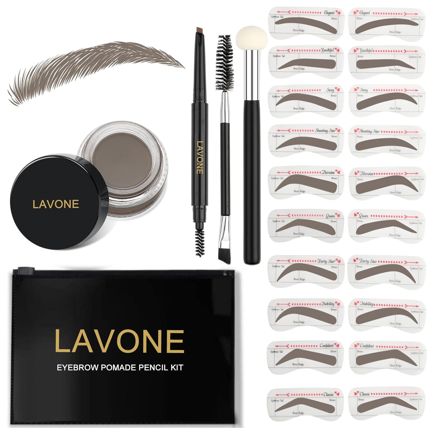 • [What’s in the eyebrow kit]: LAVONE makeup eyebrow kit includes brow pencil, eyebrow powder 20 eyebrow stencils (10 different shapes), a sponge applicator, a dual precision brush and a zipper pouch for on the go.