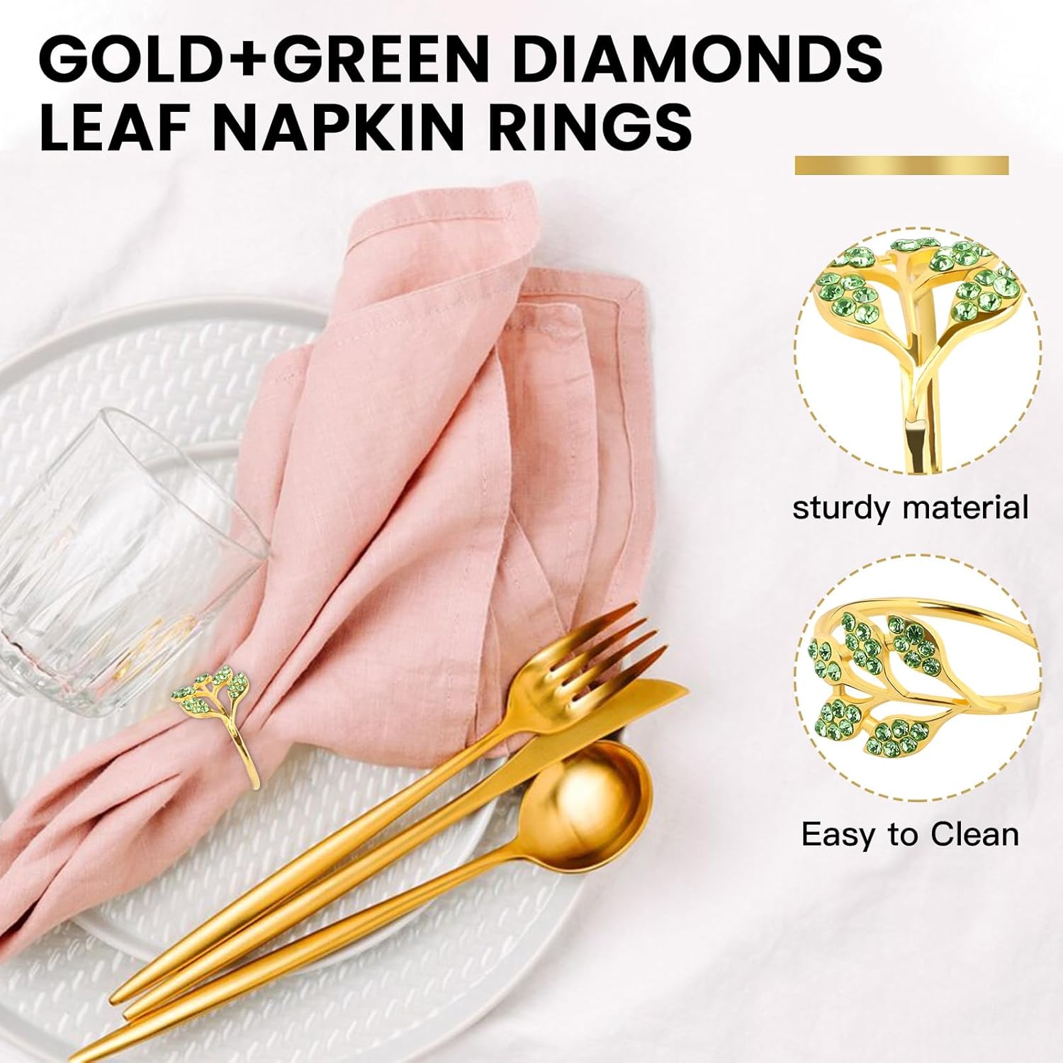 • Leaf Diamonds Napkin Ring Set: You will receive 10pcs metal napkin rings, design with leaf Gold Green Diamonds Diamonds, gold color+ Green Diamonds will add more gloss, which makes for an exquisite addition to the table setting,It would be a good choice for you add a romantic themed look to showcase your tabletop for family and guests.