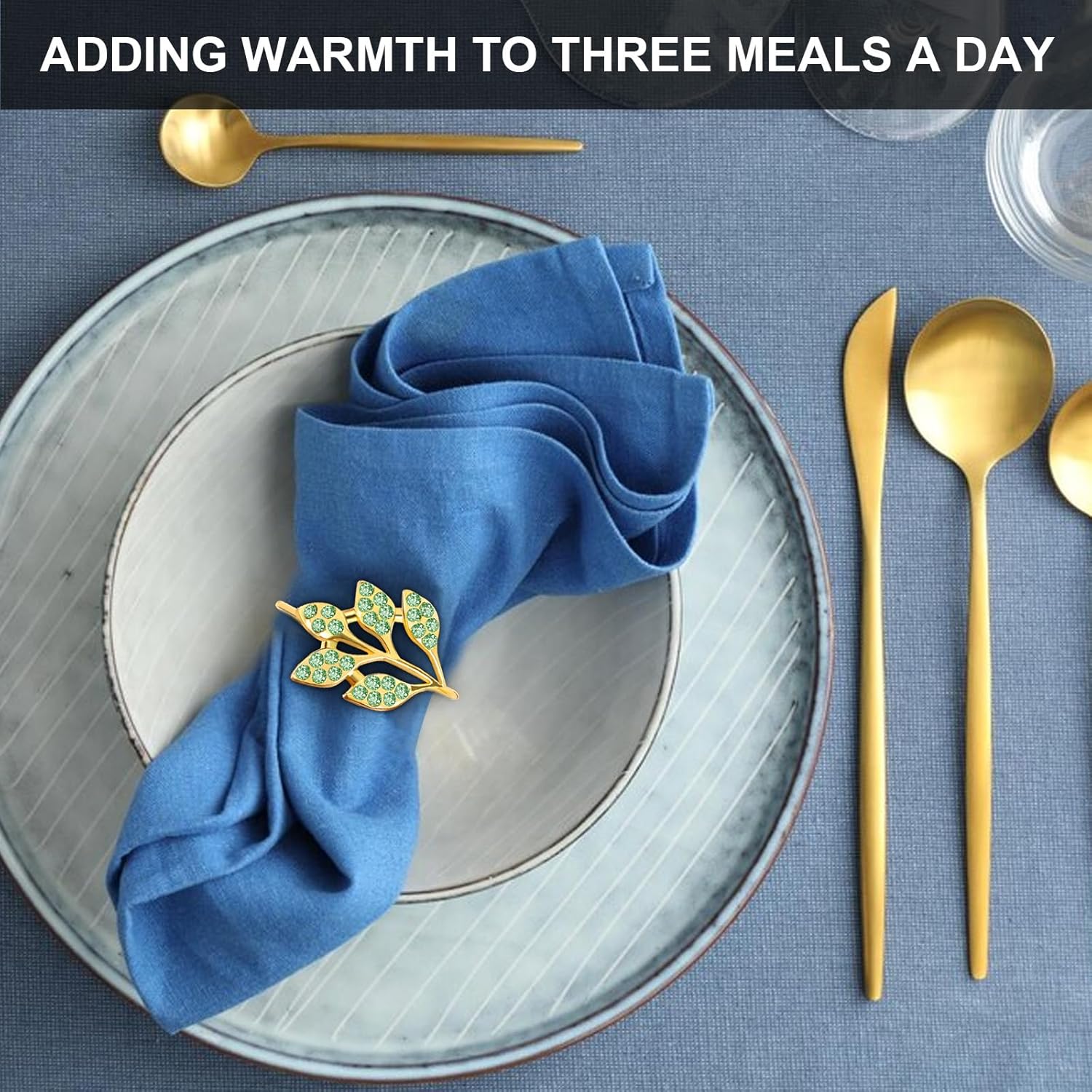 Gold Napkin Rings Set of 10,Napkin Rings Holder Buckles,Thanksgiving Christmas Napkin Ring Alloy Leaf Diamonds Napkin Ring for Dining Table Decor Wedding,Dinner Party Decorations Green Diamonds 10pcs