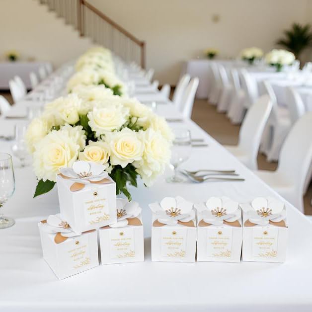 • 【Premium Material 】: 3.55x3.55x3.55 inches party favor boxes. Crafted from 350g thickness paper, durable sturdiness. With floral decor and gold foil white thank you tags, saving shopping time and designed exquisitely
