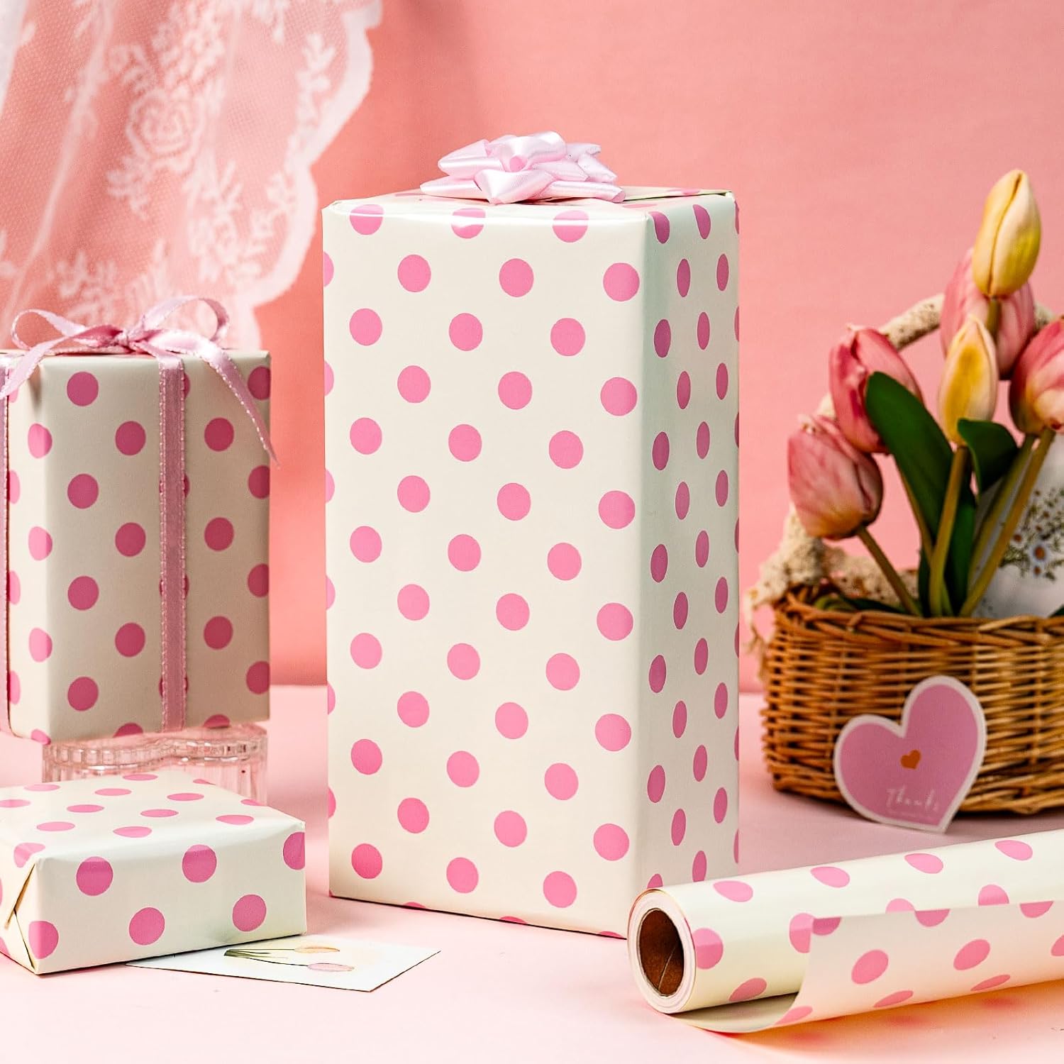 • Double-Sided Wrapping Paper: One side has pink and beige polka dots, and the other is solid pink, making your gift wrap both fun and elegant