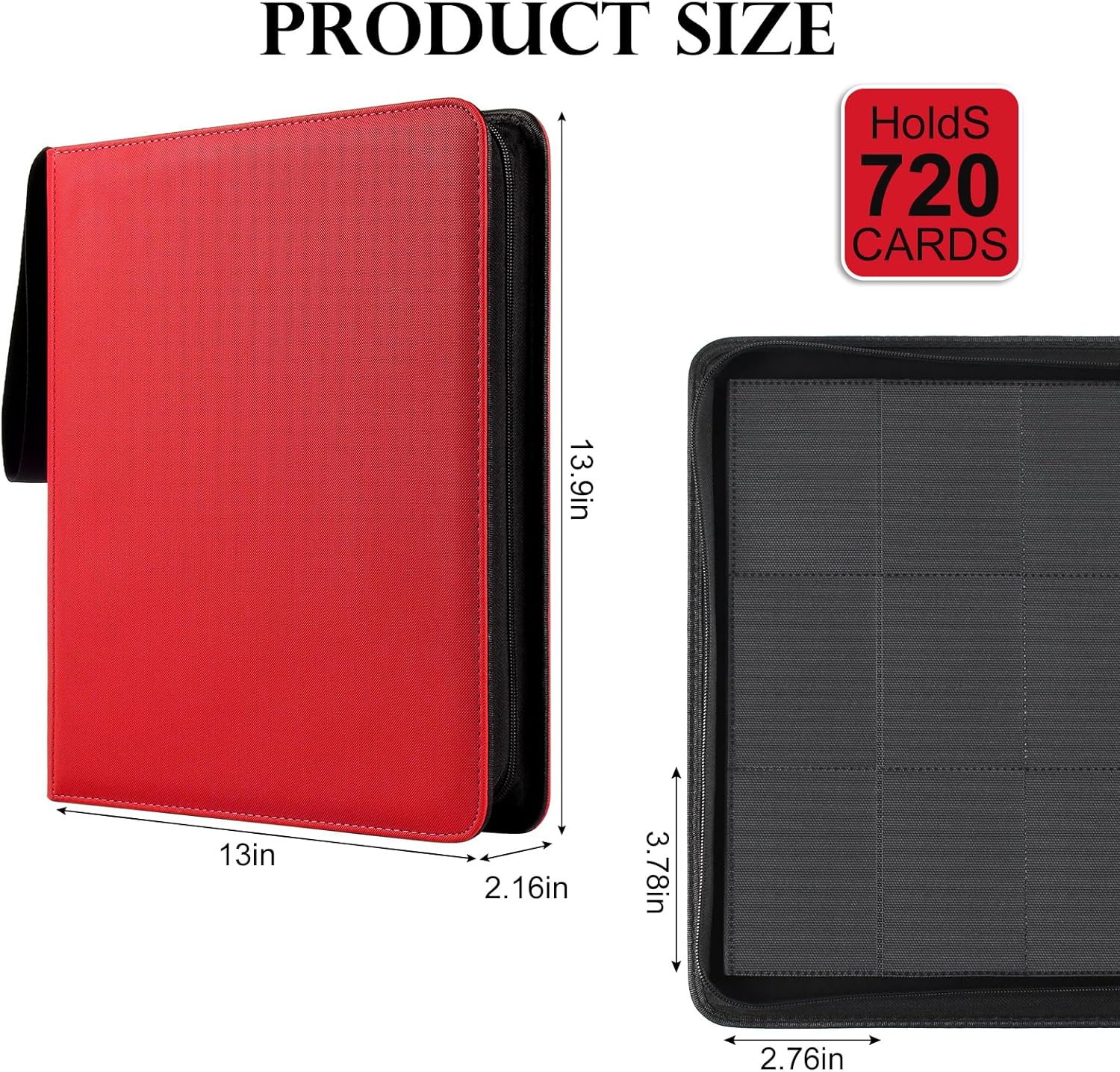 GEAoffice 12 Pocket Trading Card Binder for 720 Cards, Sturdy PU Cover Side Loading Zipper Collection Binder Album for MTG, TCG, Game & Sports Cards, Ringless, Non-PVC, Red