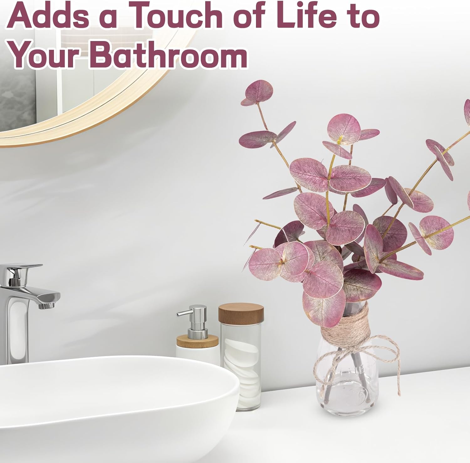 Artificial Eucalyptus Stems in Glass Vase with Faux Water, 15" Small Bathroom Greenery with Double-Sided Red Leaves, Farmhouse Office Decor, Realistic Fake Plant Wedding Centerpiece