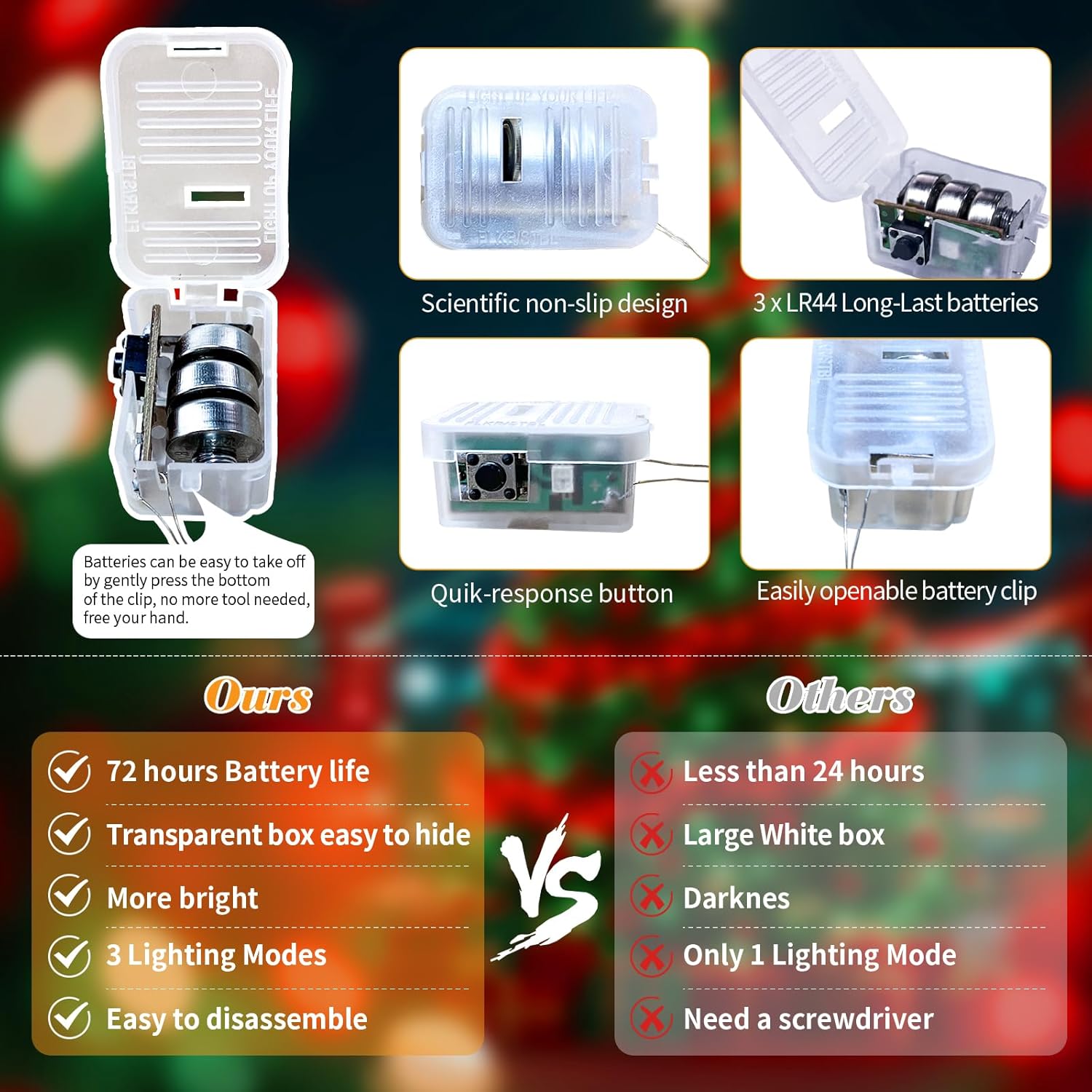 • UPGRADED DESIGH AND EASY TO REPLACE: The fairy lights'newest clear and small battery box is 0.78*1.20 inches in size, very easy to hide into all your DIY projects. The upgraded battery pack has scientific non-slip design on both sides, which makes it feel comfortable and easy to catch. Batteries are also very easy to take off, no more screwdriver needed, just gently press the bottom of the clip to open, free your hand