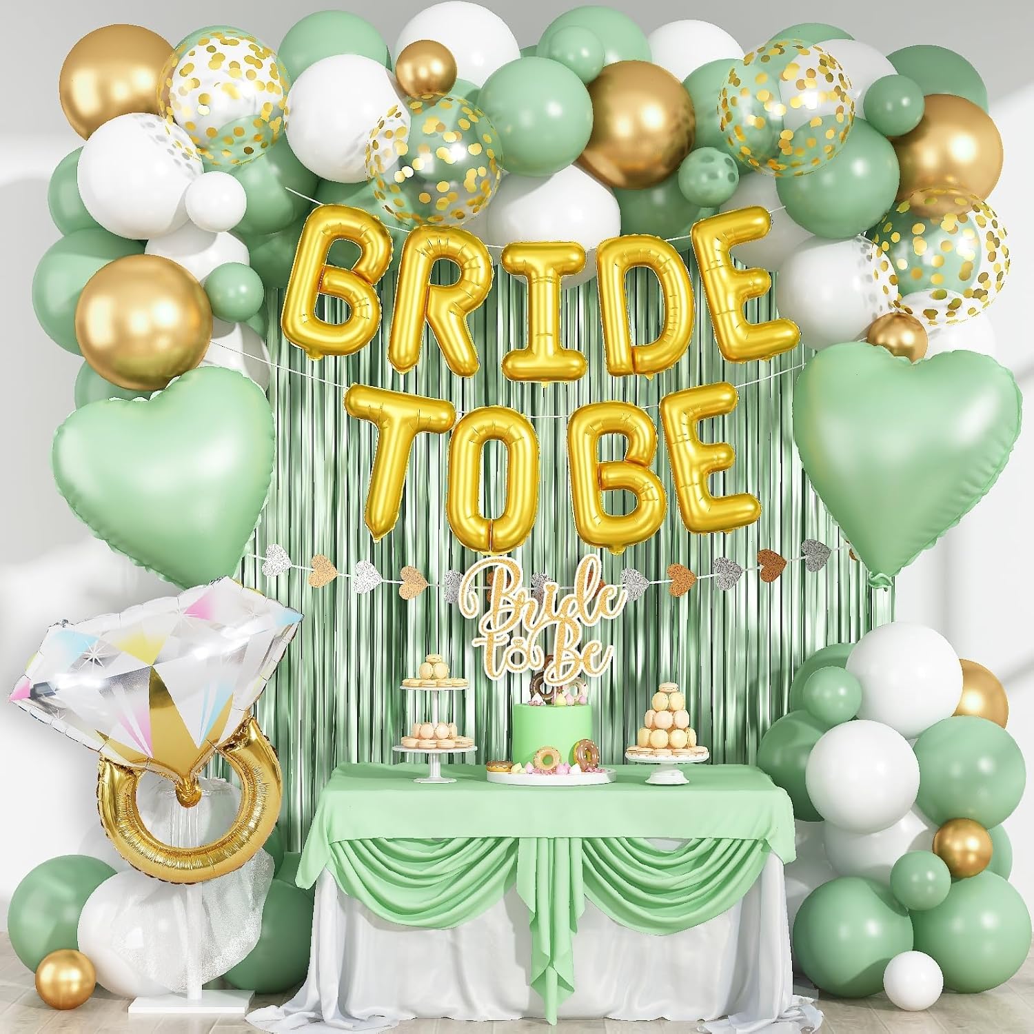 • Sage Green Bachelorette Party Decorations: These bachelorette accessories for bride include 1pc 16" gold BRIDE TO BE foil balloon, 2pcs sage green fringe curtains, 2pcs 18" heart balloons, 1pc cake topper, 1pc color hearts banner, 12" sage green/gold/white/gold confetti balloons(18pcs), 5" sage green/gold/white white balloons(9pcs) and 3pcs balloon tools—perfect for bridal celebration setups.