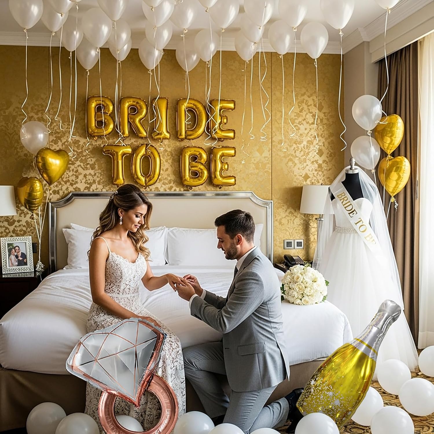 • Complete Bridal Glamour: All-in-One Celebration! This kit provides everything to create a fully coordinated and glamorous bridal theme. Beyond the elegant balloons, you get prominent gold "BRIDE TO BE" foil letters, romantic gold heart-shaped foil balloons, celebratory champagne bottle foil balloons, an impressive diamond ring foil balloon, a beautiful veil, and a chic sash. This ensures a cohesive and immersive setting for capturing those precious pre-wedding memories.