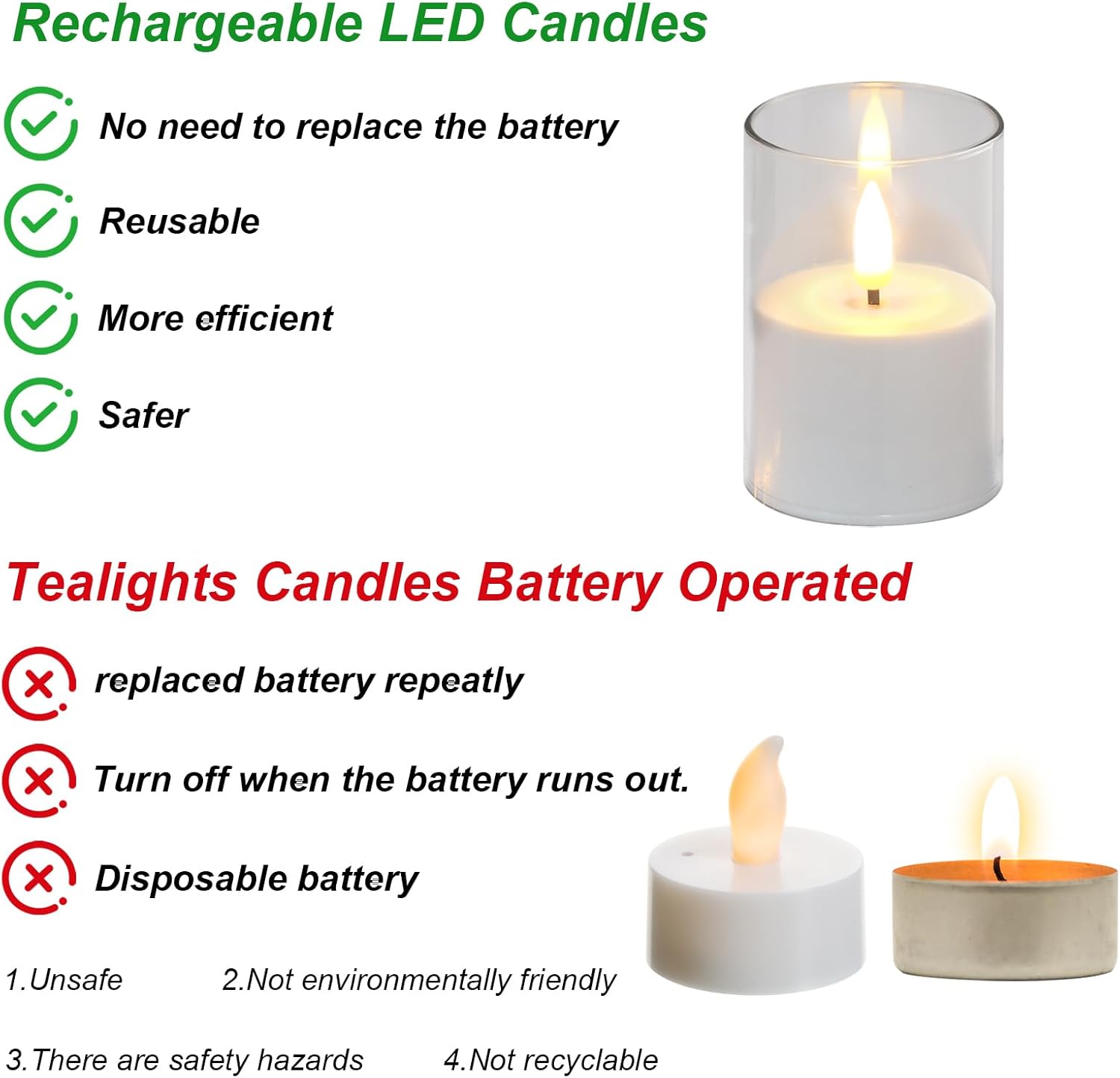 • RECHARGEABLE TEA LIGHTS CANDLES: Rechargeable for repeated use. One set provides endless convenience and savings, freeing you from the hassle of constantly replacing batteries or buying new ones. Enjoy a warm, beautiful ambiance with a simpler, more eco-friendly solution