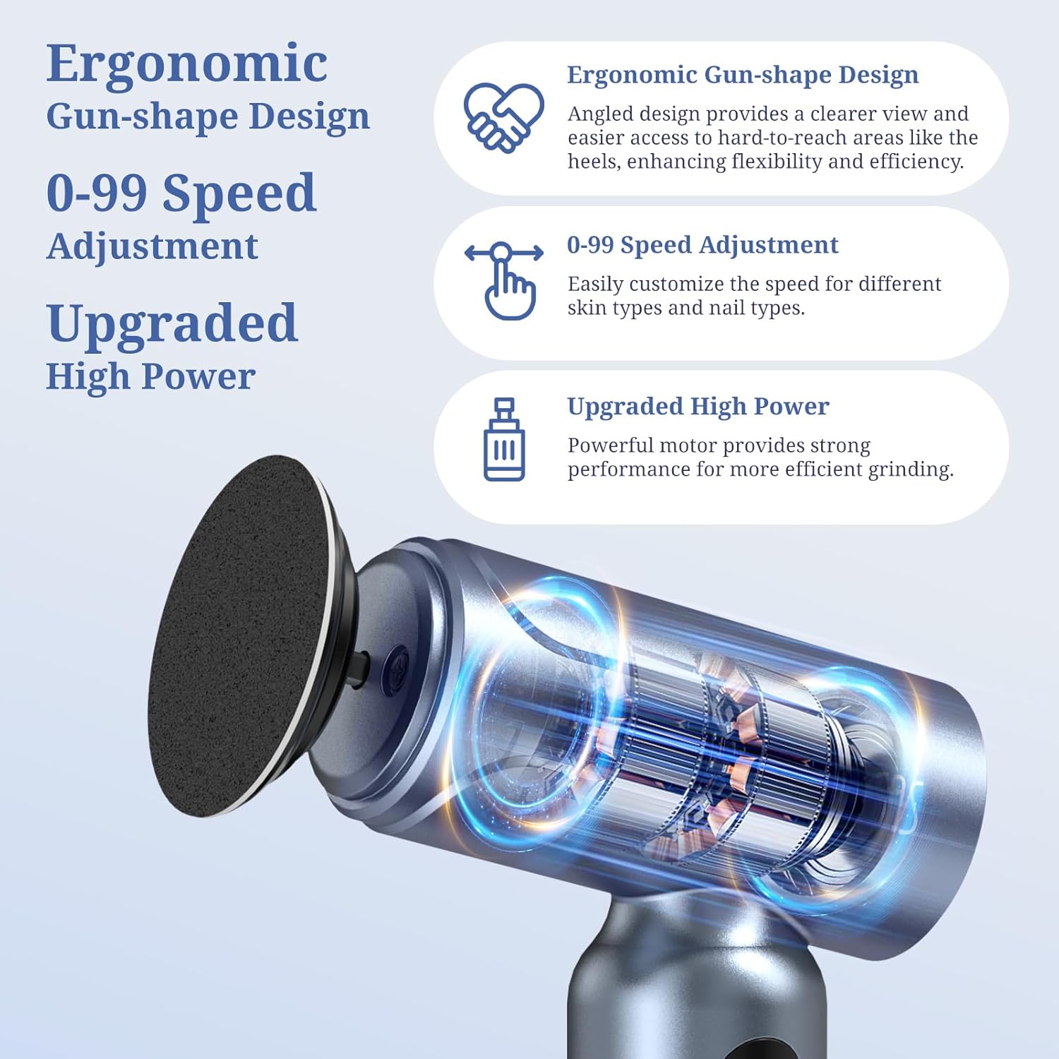 • [0-99 Speeds & High Power] -PELCAS Electric Foot File can adjust the speed from 0 - 99 levels, allowing you to easily customize the speed according to different skin types and nail types. The powerful motor provides strong performance for more efficient grinding. High-speed and stable rotation ensures smooth operation and is not easy to stall, making foot care easier and more effective. At the same time, it makes nail polishing more even, delicate and controllable.