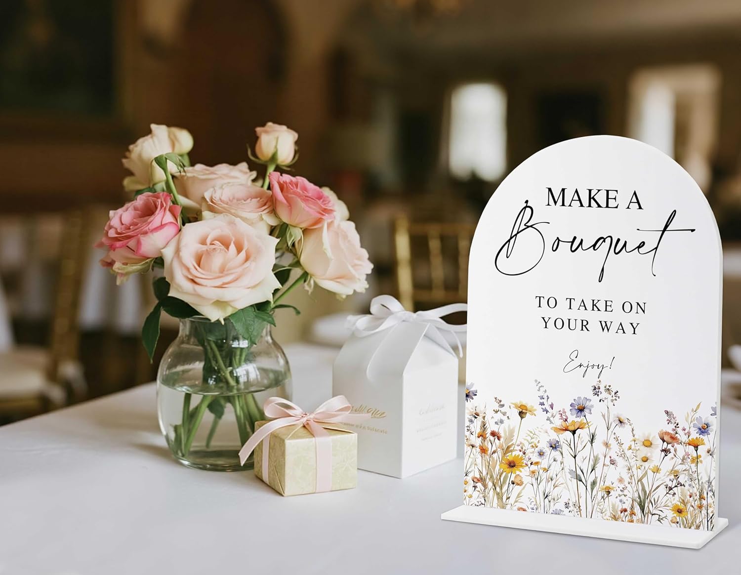 Wedding Signs for Ceremony and Reception, Boho Floral Acrylic Make A Bouquet Sign Sign, Wedding Signage with Stand, Bridal Shower Table Centerpieces, Supplies for Engagement Reception Event Party, 21