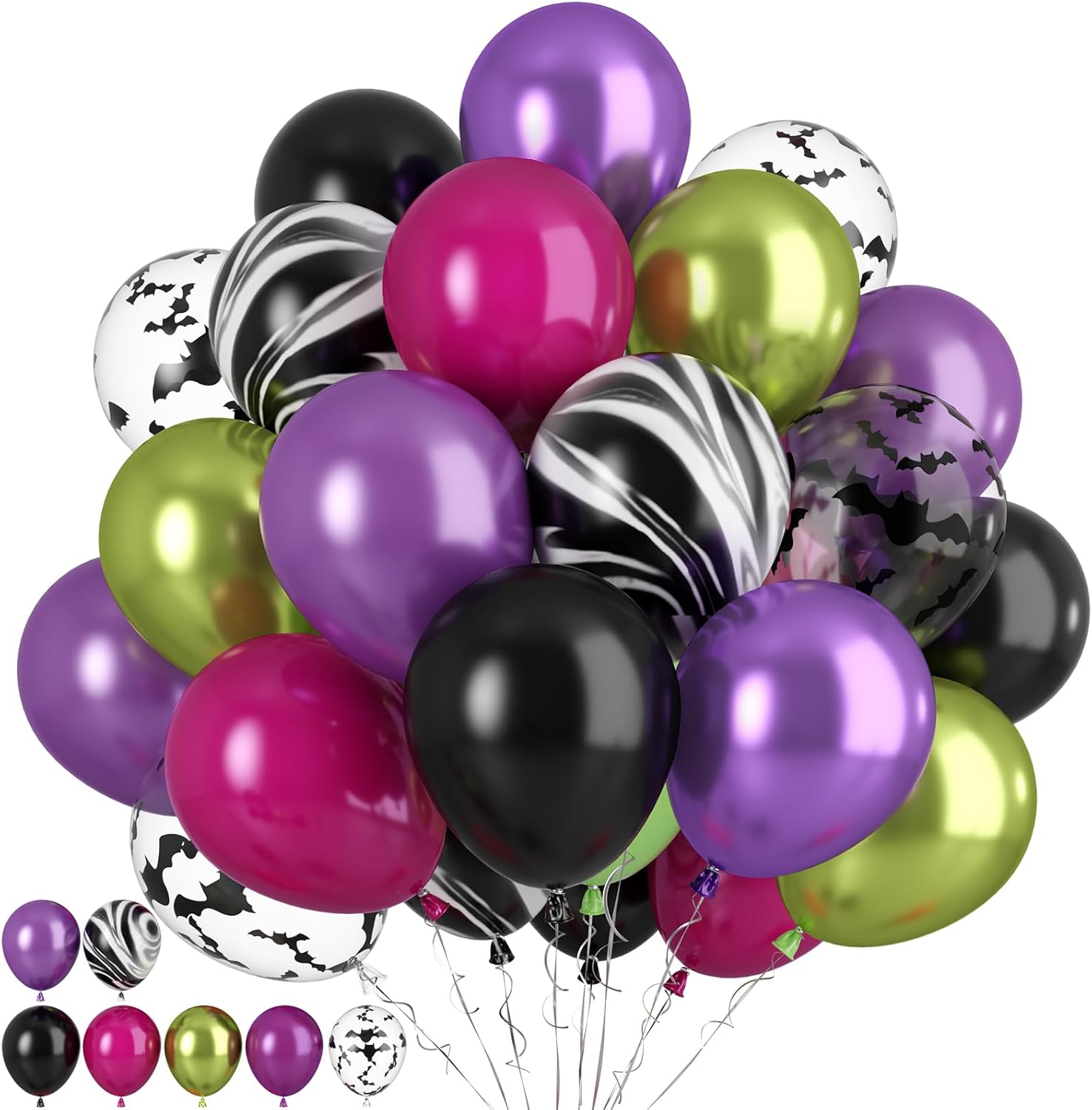 Paready Black Purple Pink Halloween Balloons, 60 Pcs Hot Pink Black Green Party Balloons, Metallic Green Purple Balloon Bat Printed Agate Balloon for Halloween Birthday Home Garden Party Decoration