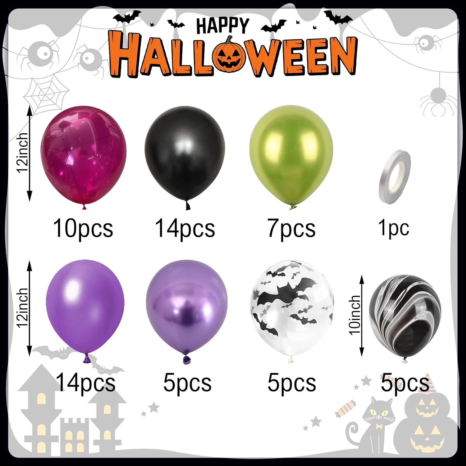 • Helloween Balloons Set: This hot red green balloons set includes 10pcs hot pink balloons, 14pcs pearl black balloons, 7pcs metallic green balloons, 14pcs pearl dark purple balloons, 5pcs metallic purple balloons, 5pcs bat printed balloons, 5pcs agate balloons, and 1pc silver ribbon. Adding a playful seasonal vibe, it offers everything needed to create a vivid and unforgettable party display.