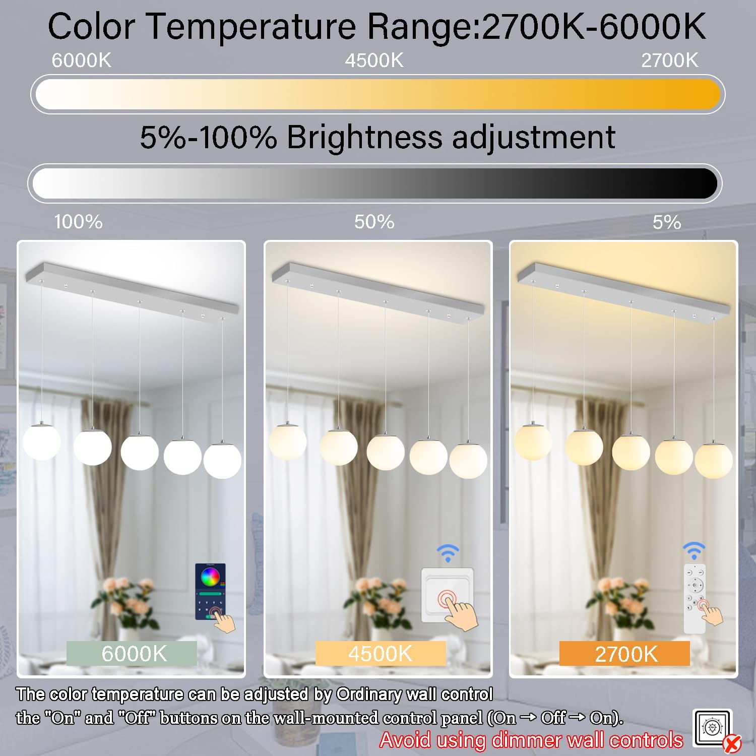 • 【Smart LED Linear Chandelier 】It is equipped with a remote control and APP control for seamless dimming between warm white (2700K) and cold white (6000K), as well as adjustable brightness ranging from 5 to 100 percent.