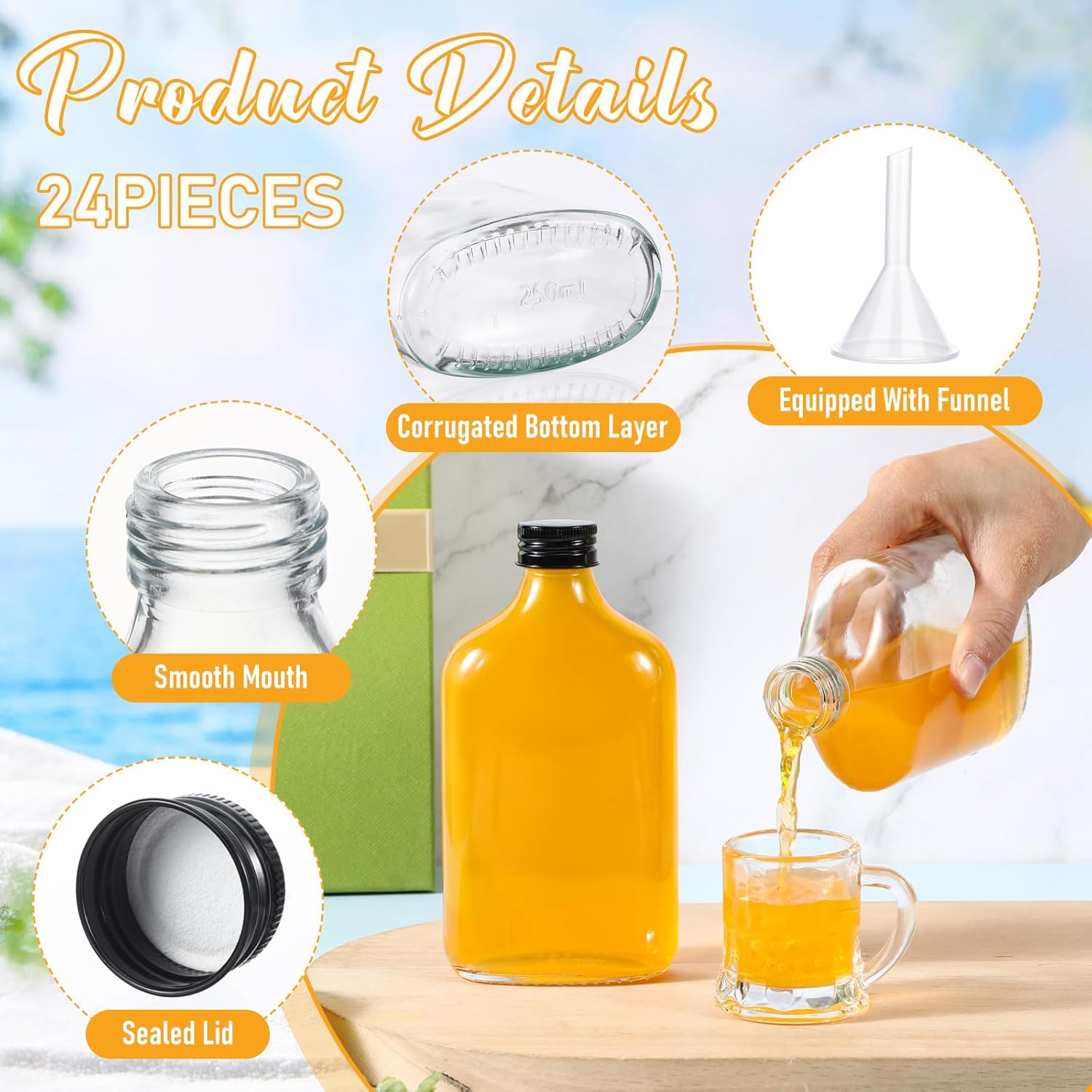 Gejoy 24 Pcs Mini Liquor Bottles Reusable Glass Flask Bottles with Black Caps Clear Empty Alcohol Shot Jars Small Champagne Jars with 4 Funnels for Wine Weddings Party Favors Christmas(8.5 oz)