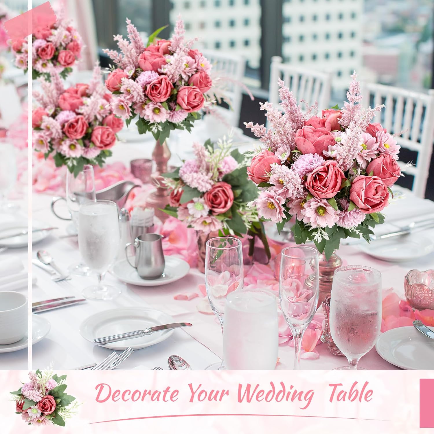 • Vibrant Splashes of Bean Paste Pink: this package includes 8 bouquets of bean paste pink silk flowers in 7 heads, offering a stunning array of vibrant bean paste pink shades to your decor; Each bouquet containing 7 prongs of 7 flowers, including 2 large peonies, 2 large ball chrysanthemums, 2 medium ball chrysanthemums, 1 large hydrangea, 3 foam fruit in the middle