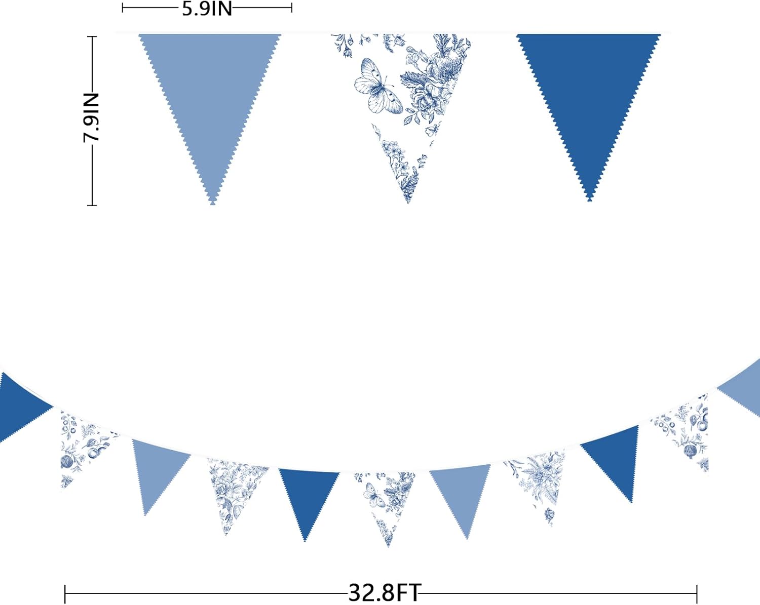 32Ft Blue Floral Party Decorations Vintage Blue White Flower Pennant Banner Fabric Triangle Flag Garland Streamers for Floral Wedding Porcelain Birthday Baby Bridal Shower Garden Tea Party Decor