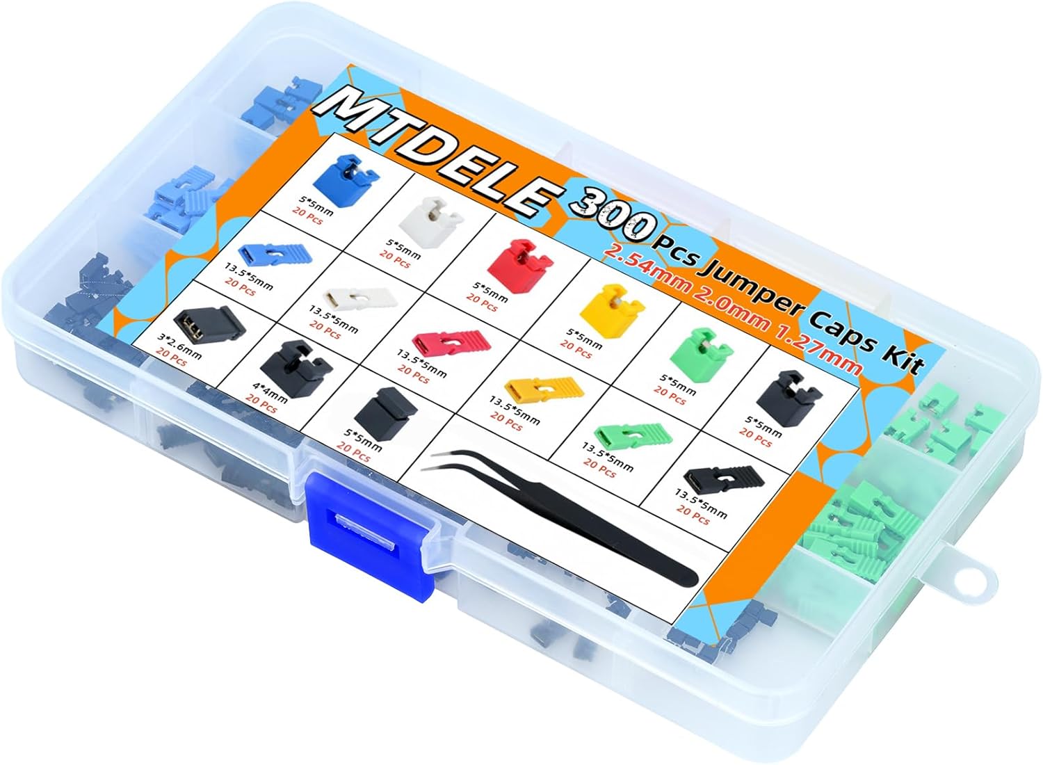 • Included Components : 300Pcs Jumper Caps Kit 2.54mm 2.0mm 1.27mm;1Pcs Tweezers