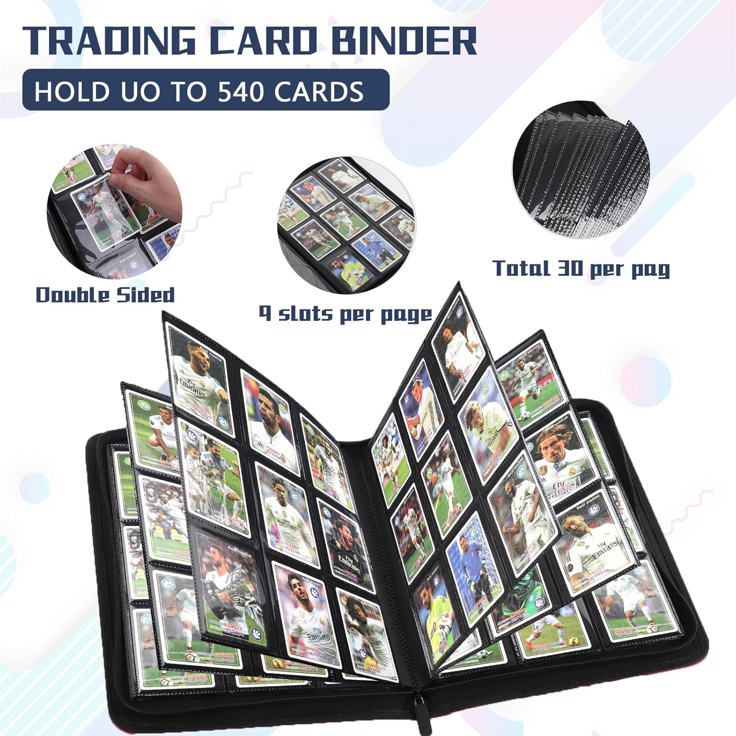• LARGE CAPACITY CARD STORAGE:Smooth zippered card holder with 9 pockets per page,30 double sided pages hold up to 540 cards,providing plenty of space for card collectors and players to organize their cards
