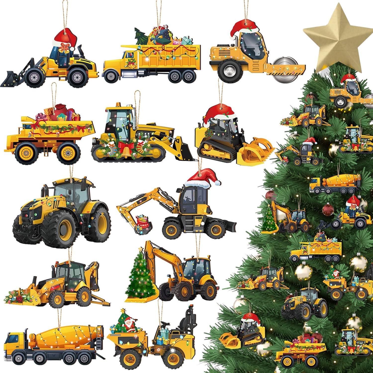 Suzile 36 Pcs Christmas Wooden Ornaments Christmas Construction Truck Ornaments Decoration Vintage Excavator Tree Decoration Construction Truck Hanging Crafts for Farmhouse Home Xmas Party Decor