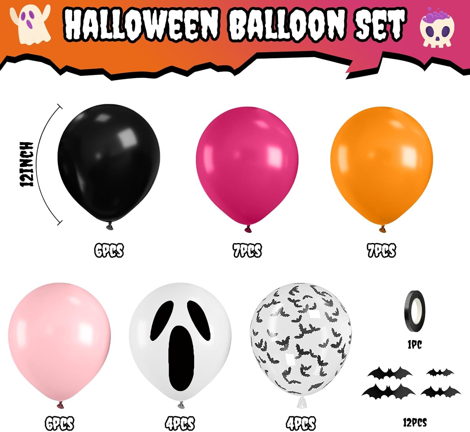 • 35 Pcs Halloween Balloon Set: Bring spooky fun to your Halloween celebration with this vibrant Halloween balloons set, including 7* hot pink balloons, 7* orange balloons, 6* pastel pink balloons, 6* black balloons, 4* bat-print balloons, 4* ghost-print balloons, 1*10m ribbon, and 1 set of 3D Halloween bats stickers. These Halloween balloons create a fun, spooky backdrop for parties, trick-or-treating, and photos.