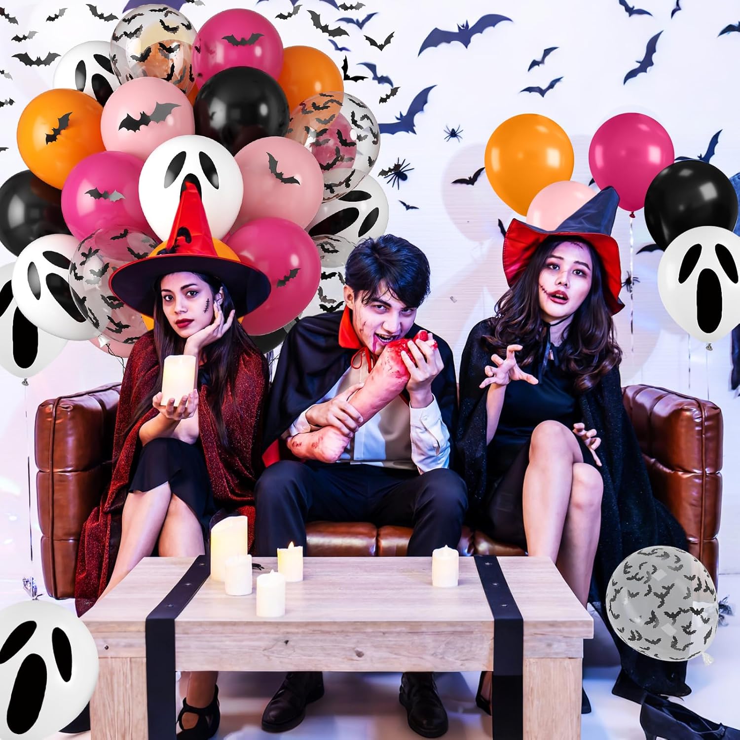 Orange Pink Halloween Balloons, 12 Inch Ghost Balloons, Black Orange and Hot Pink Latex Balloon with Bat Sticker, Bat Print Balloon for Kids Girls Birthday Ghost Theme Halloween Party Decorations