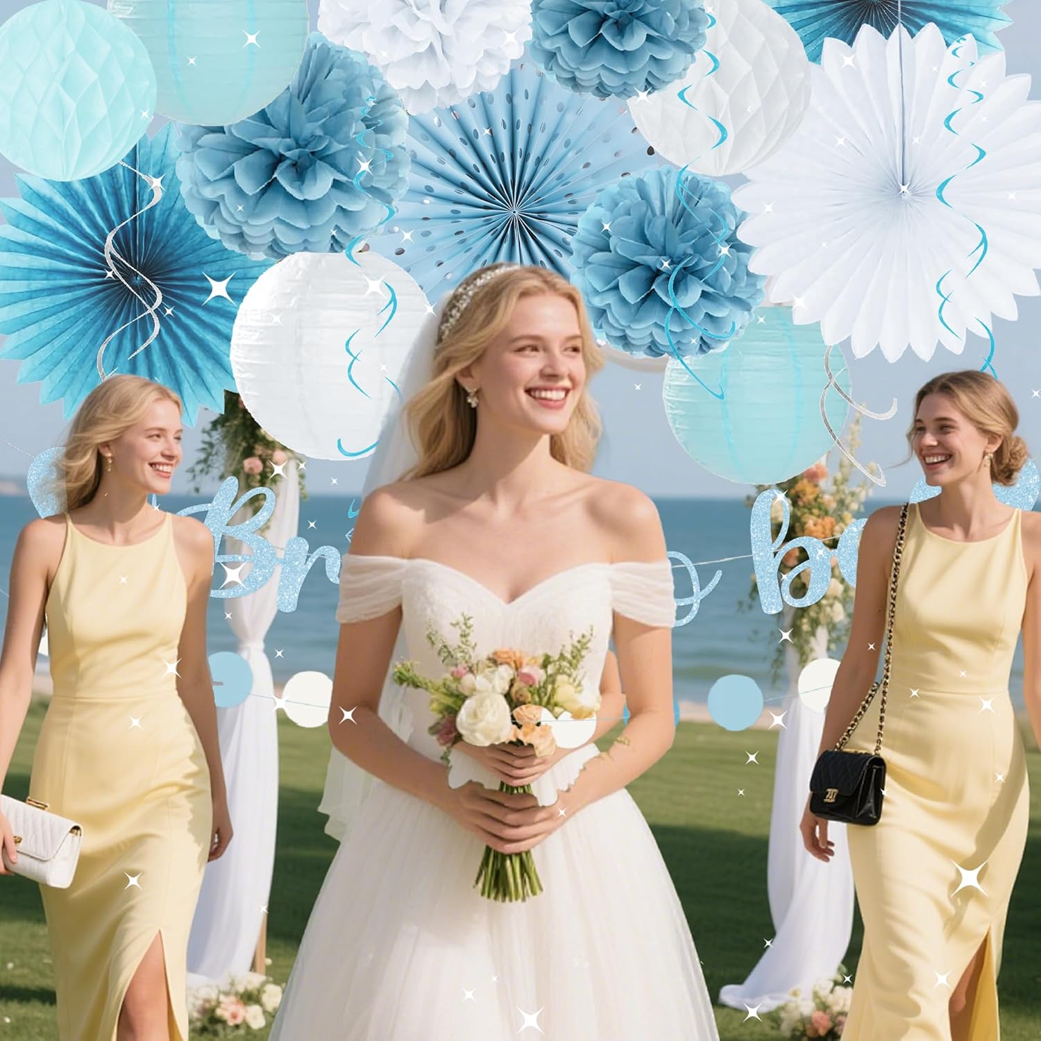 Holkcog Blue White Bachelorette Party Decorations, 21pcs Women Bridal Shower Decor Garland Paper Streamers Lantern Swirls for Girls Boys,Wedding Decoration, Blue Bride To Be Gilrs Wedding Party Supply