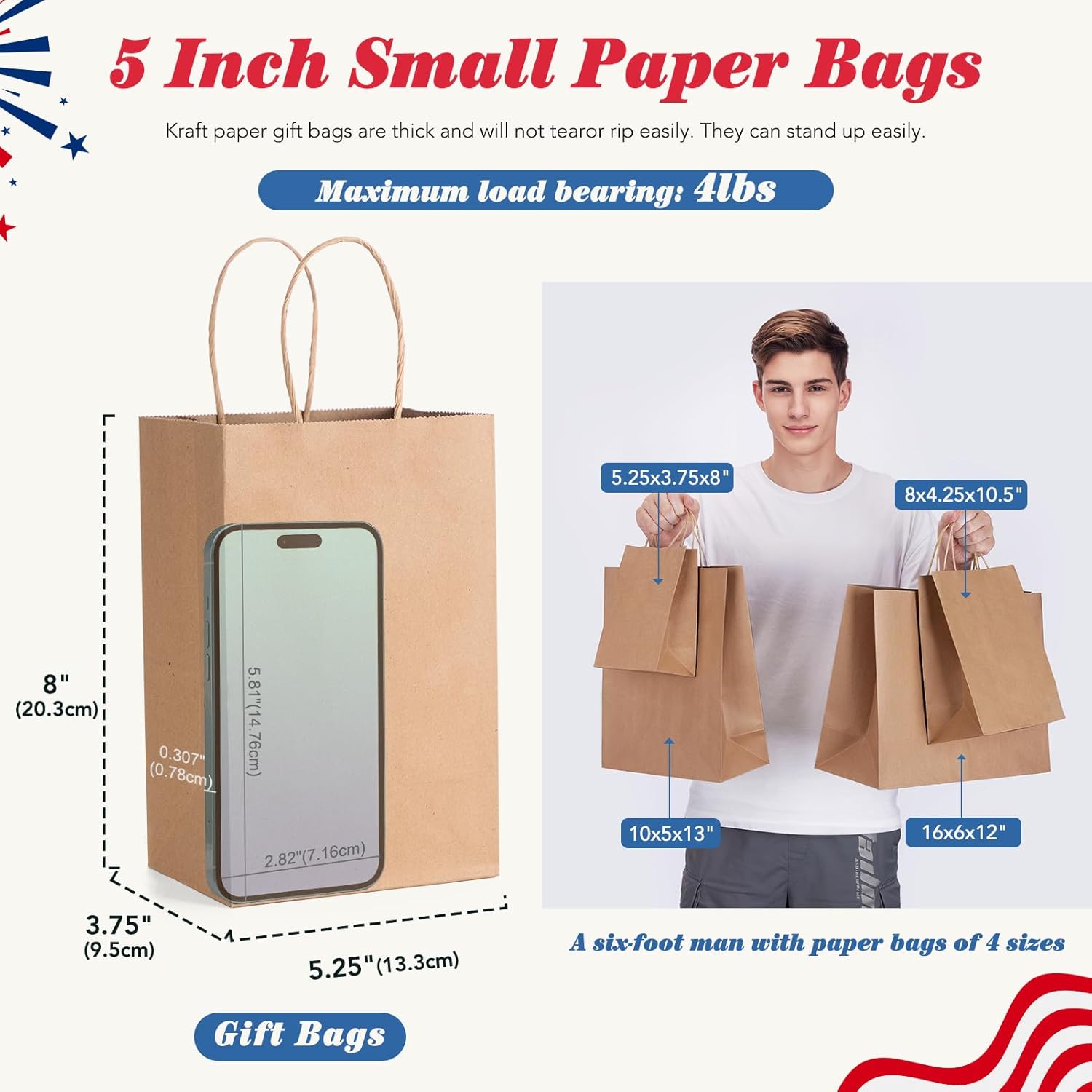• GSSUSA Small Gift Bags: Brown paper bags with premium 100 GSM kraft paper. Craft bags with sturdy twisted handles support up to 4 pounds. Gift bags with handles feature reinforced box-shaped bottoms for durability. Thick paper gift bags have smooth surfaces with no stray glue residues