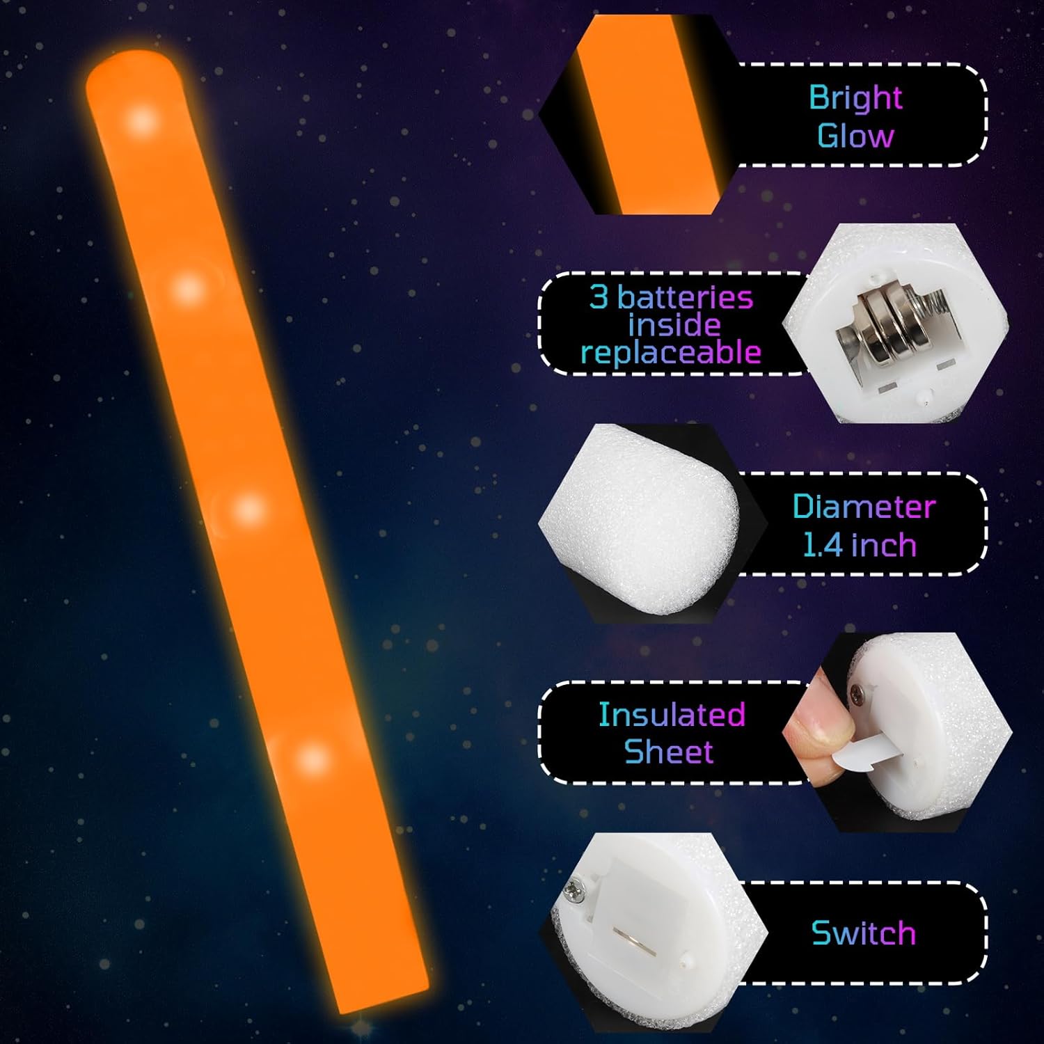 • Glow Foam Sticks Bulk:Our giant 30 piece orange foam glow sticks have vibrant colour, spice up your glow parties with these foam glow wands and decorations for background or use as giveaway toys. Great for raves, sports events, birthday, concerts, weddings, bars, carnivals, Christmas, New Year’s, the 4th of July, Halloween and more