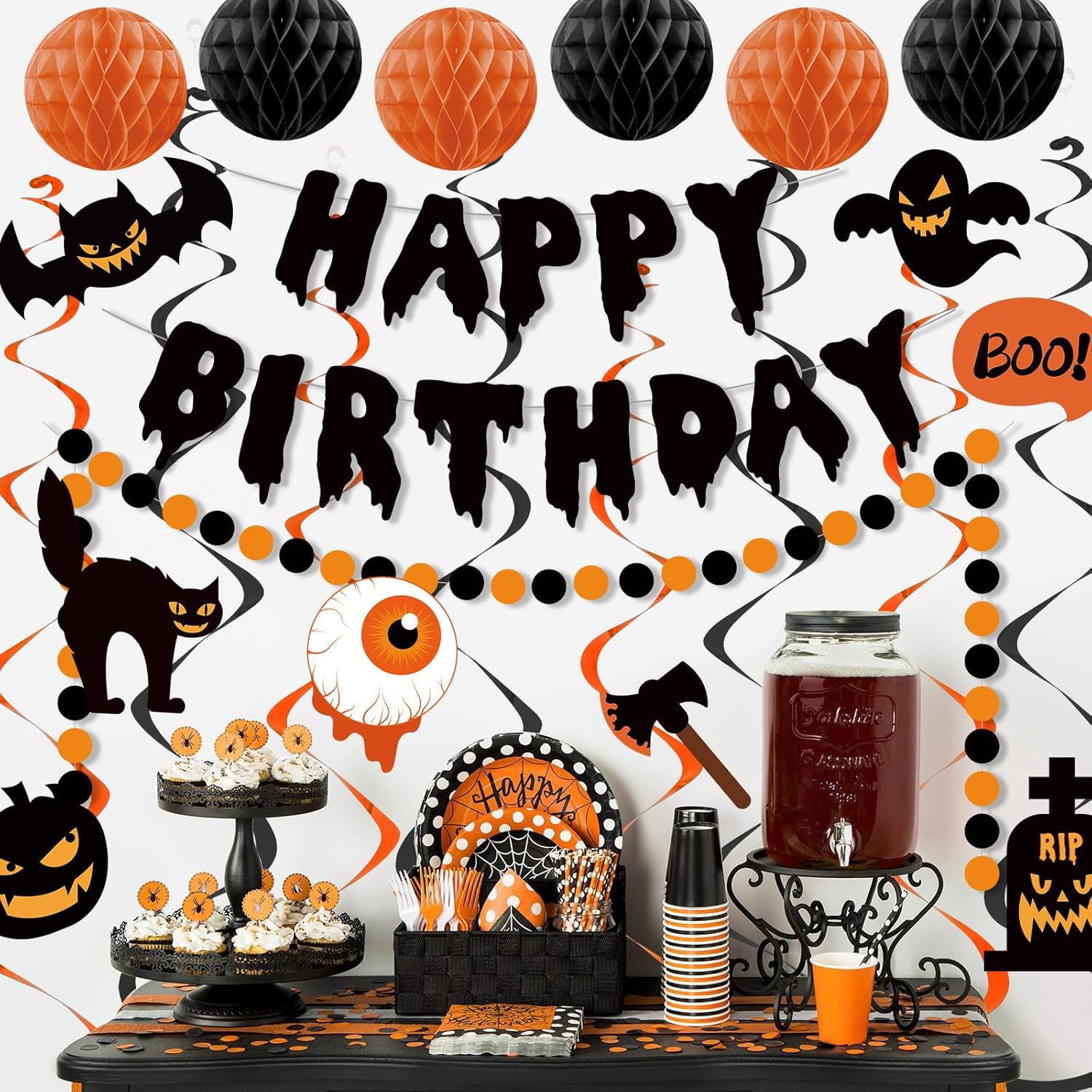 • Spooky & Vibrant Design: Our Halloween birthday party decorations feature a unique “Happy Birthday” banner with spooky fonts, paired with honeycomb balls, swirl streamers, and circle dot garlands. The classic orange and black color scheme instantly creates a festive and spooky party vibe.