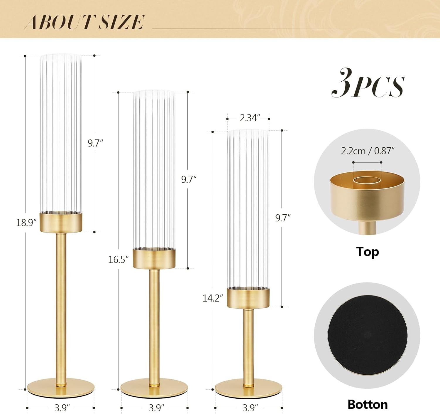 • FIT FOR 7/8 STANDARD SIZED TAPER CANDLES - Ideal Size for Decor: Set of tapered candlestick holders in 3 assorted heights: 14inches/36cm, 17nches/42cm, 19 inches/48cm (with hurricane height). The candle hole diameter measures 0.86inches/2.2cm, fits 7/8"fits standard tapered candles/ candle sticks/ flameless candles/ candlesticks!